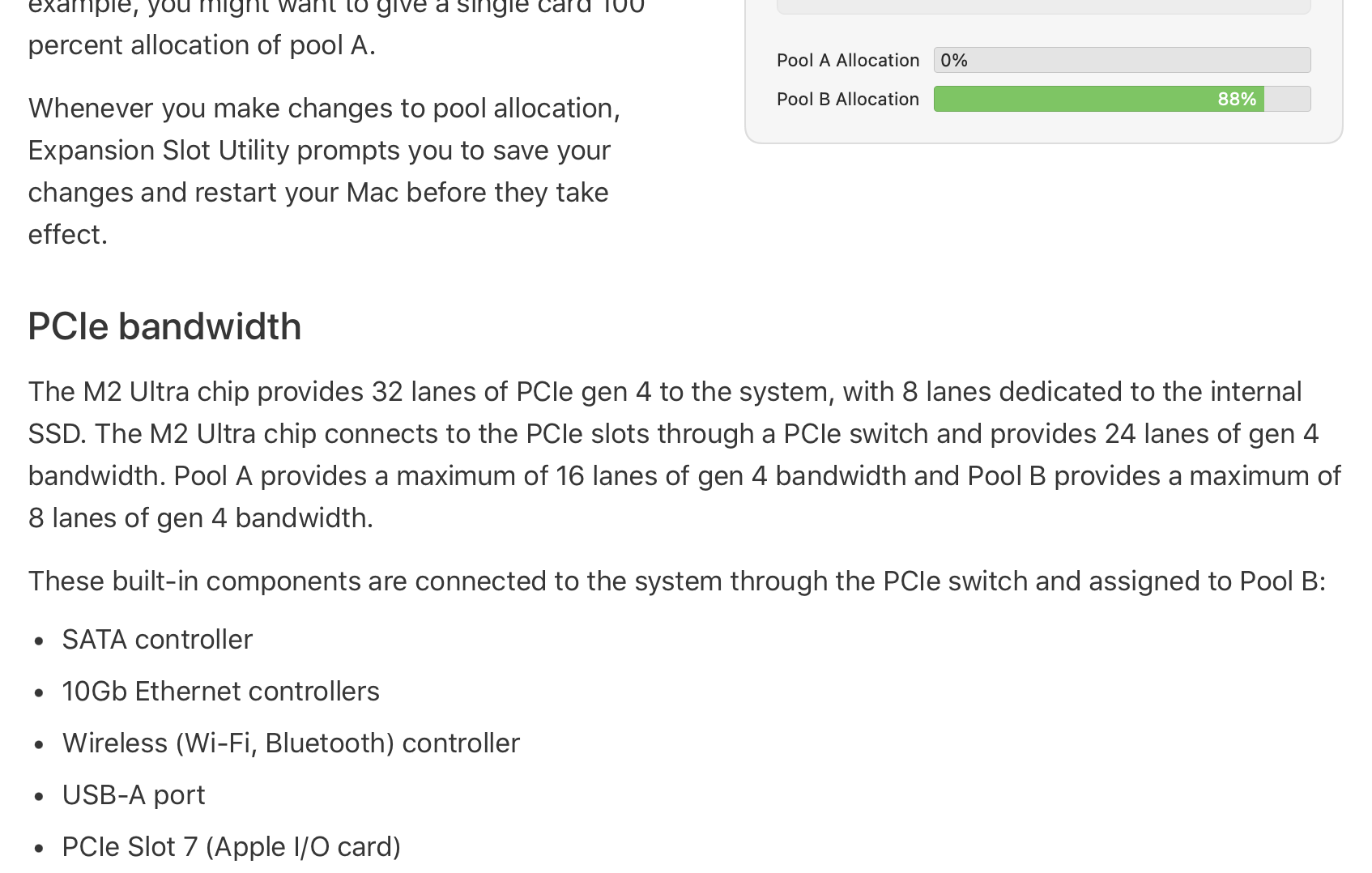 The M2 Ultra chip provides 32 lanes of PCIe gen 4 to the system, with 8 lanes dedicated to the internal SSD. The M2 Ultra chip connects to the PCIe slots through a PCIe switch and provides 24 lanes of gen 4 bandwidth. Pool A provides a maximum of 16 lanes of gen 4 bandwidth and Pool B provides a maximum of 8 lanes of gen 4 bandwidth.