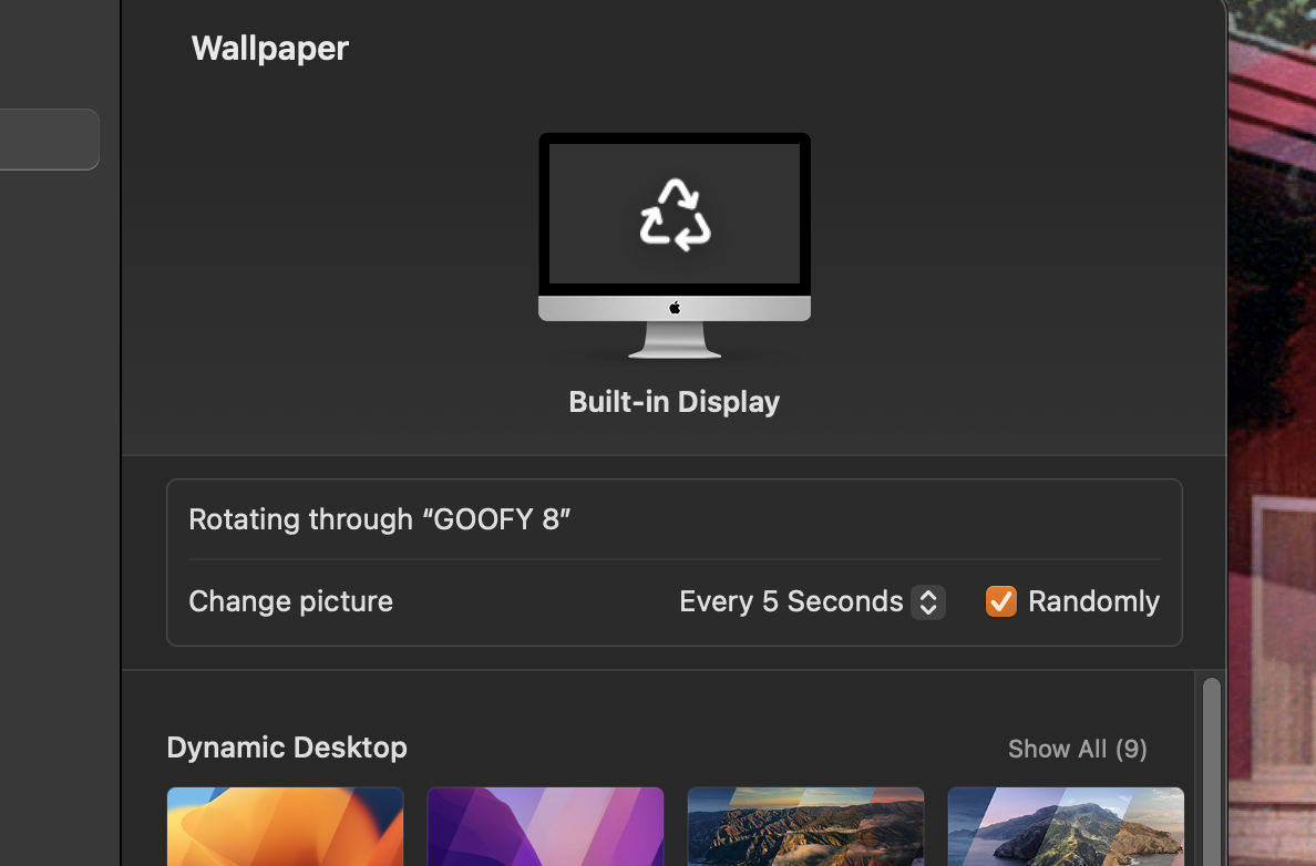 But the last question I have is, how do I get the iMac to reveal one desktop photo one at a time on the desktop from that folder. Before Ventura I could get a new photo on the desktop every 5 sec's. I hate being stuck w one desktop photo. I have 64GB RAM, why can't I use multiple (one at a time)?