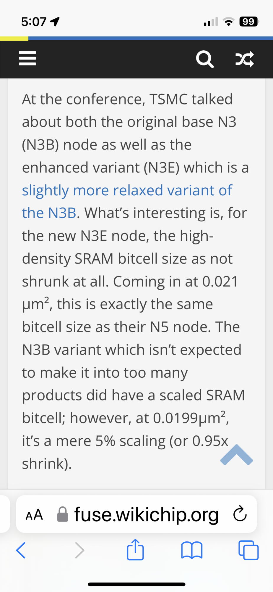 If N3B is still getting incremental yield increases through 2024 then it may not make sense at all. One report said that TSMC could be getting some new equipment to make the multipatterning they are doing for the extreme small options of N3B better. N3E's SRAM/cache is bigger (old N5 size). N3B is slightly smaller. But Apple uses higher than average amounts of cache. So likely some die size bloat. If you make the die size bigger then the N3E yield goes very incrementally down.