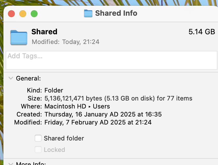 I have a Macbook Air M1 and when I check the storage there is 5.98GB in the "Other Users and Shared" segment. I am the sole user of the mac so it was confusing to me. After googling th issue I went to the shared file in my hard drive and when i click on that there is 5.14GB in the shared folder.