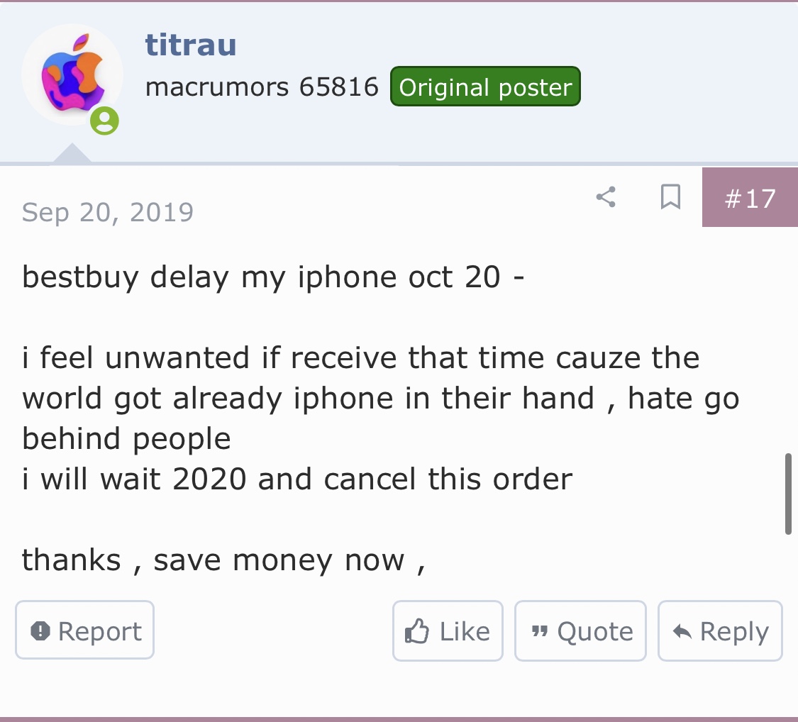 Weren’t you the same poster who said since you couldn’t get the new phone on launch day, it would already lose it’s appeal by the time you get it in Oct so you would just wait until the 2020 phone instead lol?