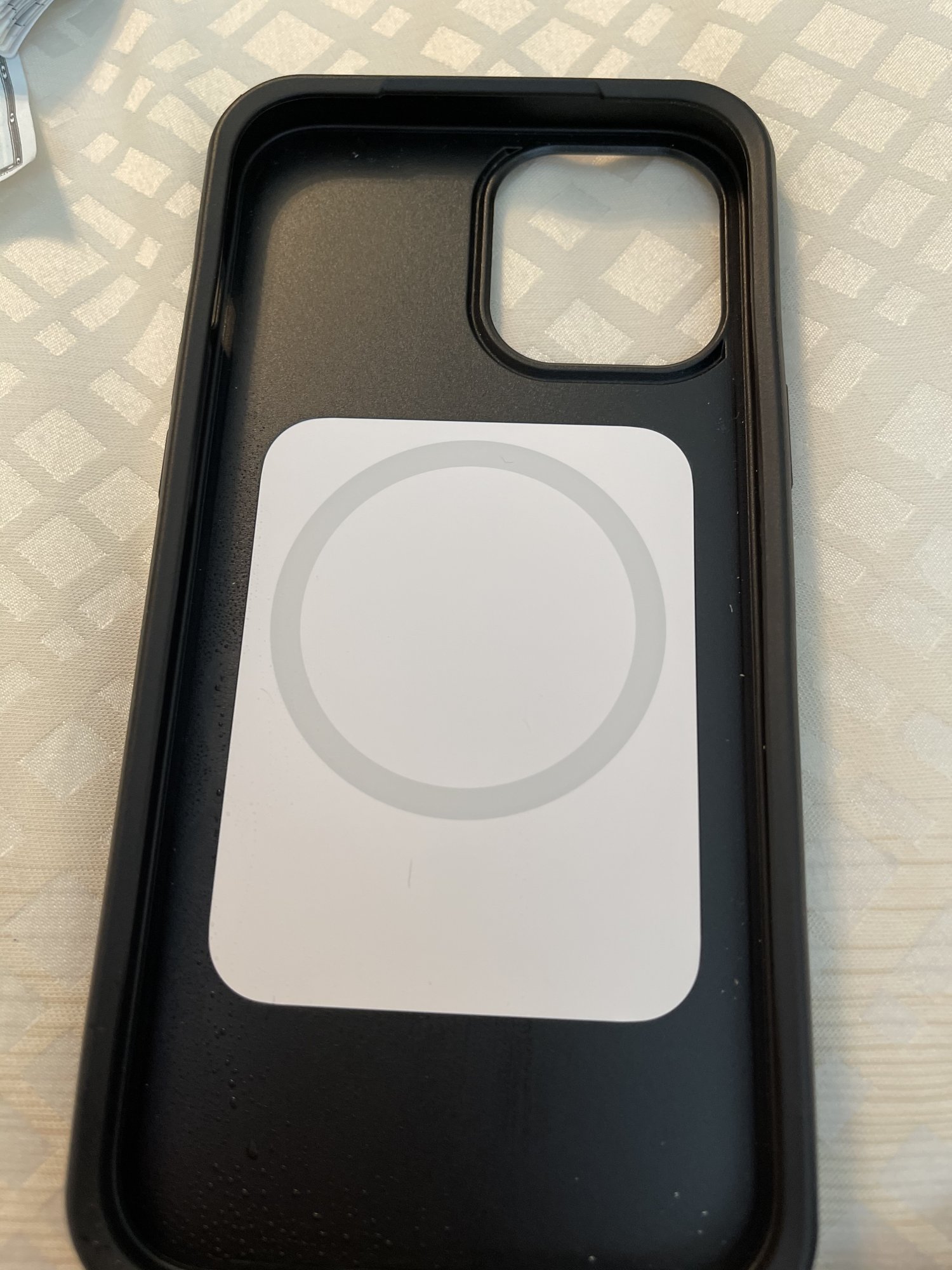 It’s doesn’t really seem to be a sticker. It seems to be placed inside. It seems like it’s got an indentation where it goes. It does not feel like a sticker to me. It definitely feels like it is embedded into the plastic because I can feel that indentation where it goes. The MagSafe connection is just as strong as on my leather apple MagSafe case as I can pick it up from the cord. And for those of you that complain like I did about how short the cord is on the Apple magsafe charger I just went on to Amazon and bought an extension for it for like I think $11 so the the cord is not so short.Thanks for the pic. Is that just a sticker stuck to the inside of the case or is it imbedded into the plastic?