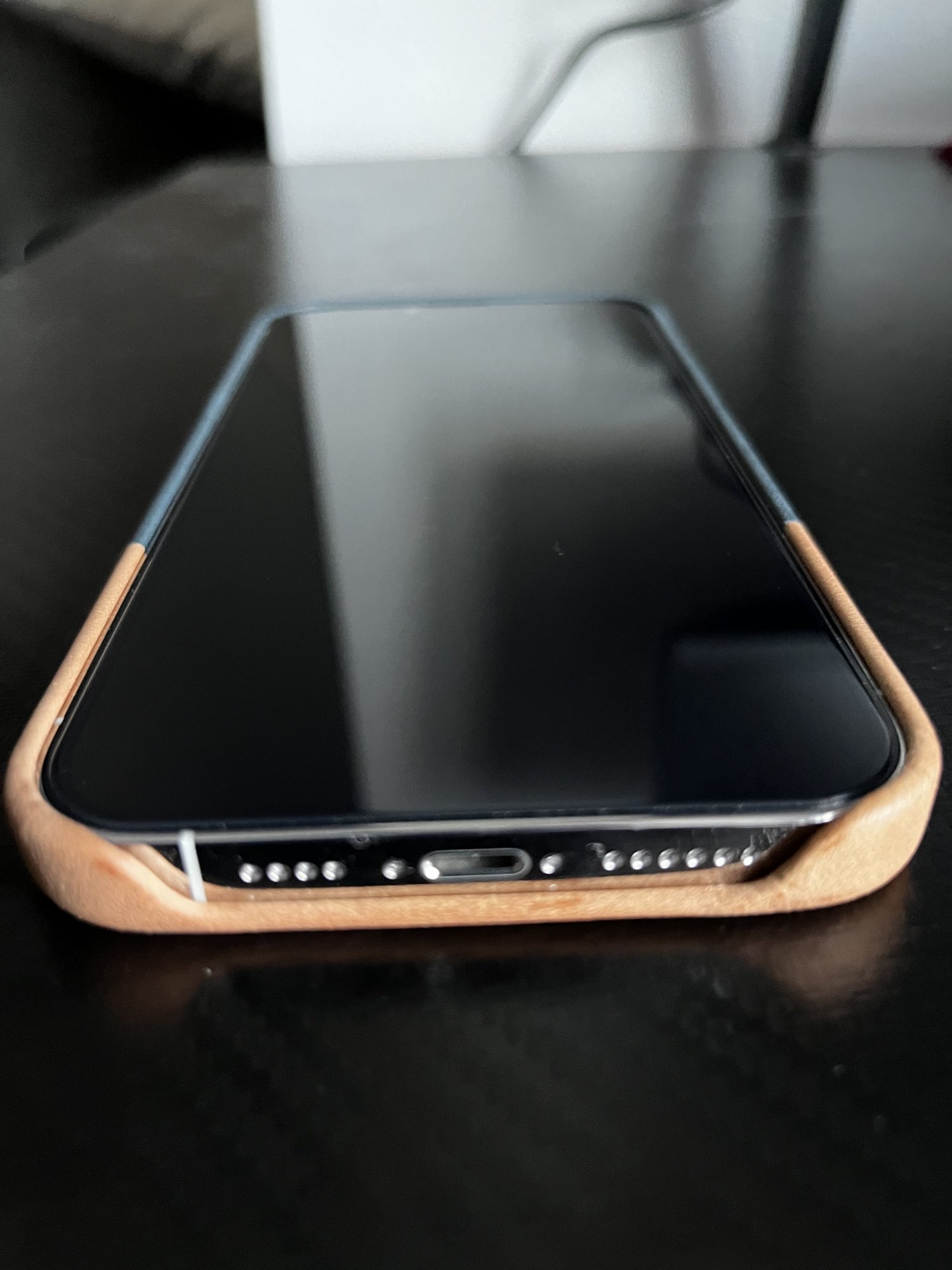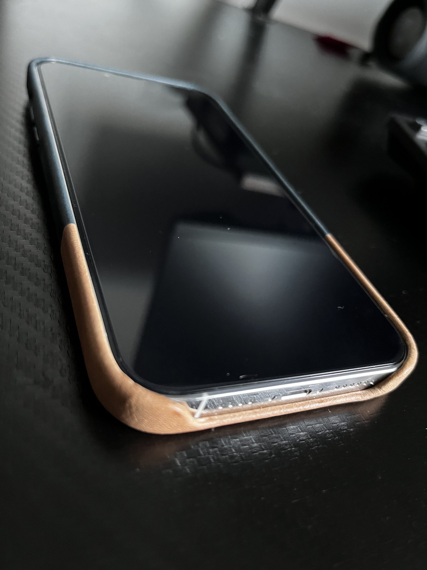 First impressions are the leather smells really nice. Fit and finish appear to be clean. Has a slightly raised lip (even with a screen protector installed) that will protect the screen when putting it facedown. The silver trim of the iPhone shows when looking at it head on but that doesn’t bother me. I was worried about the buttons but they appear to be nice and tactile.