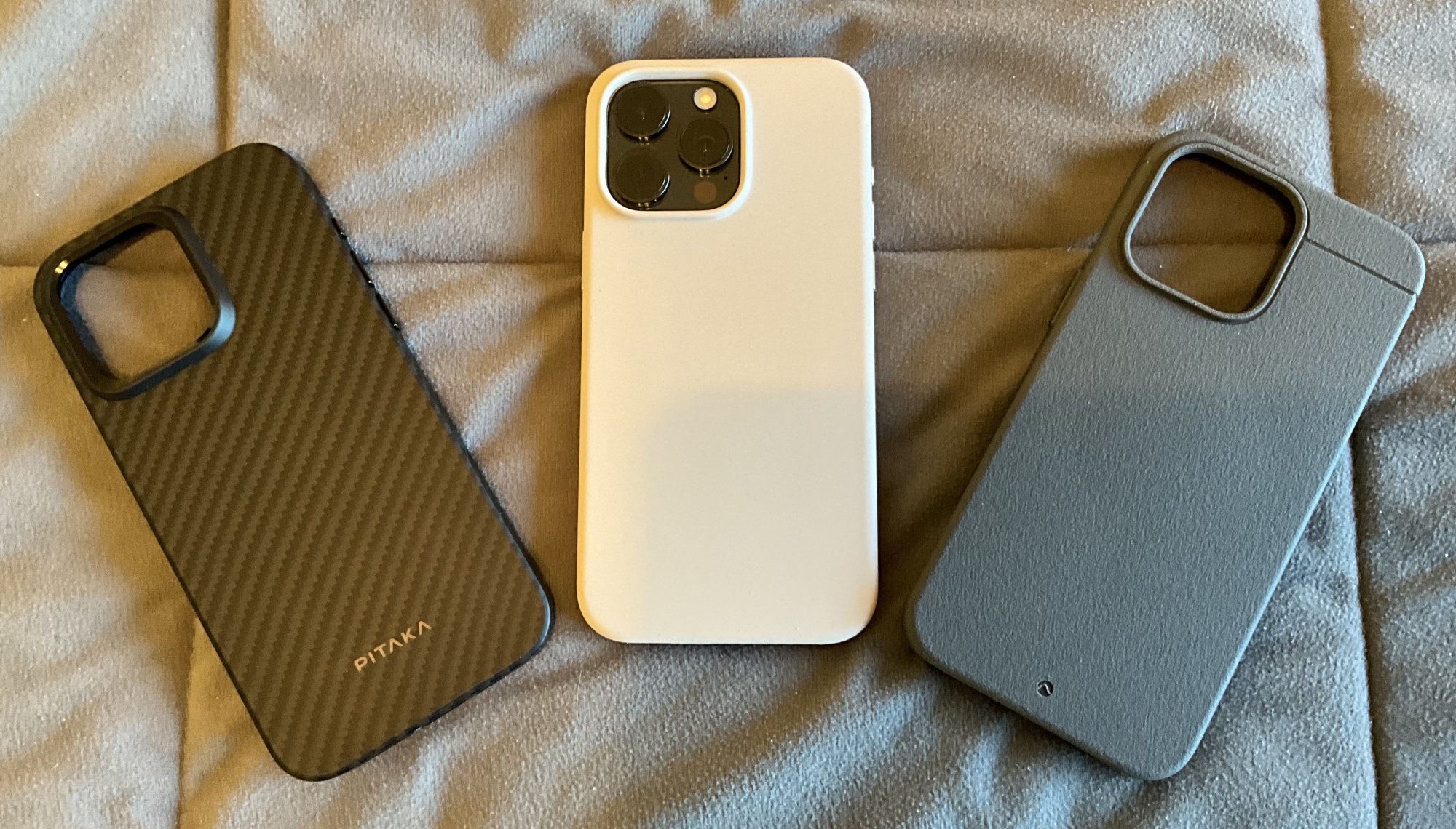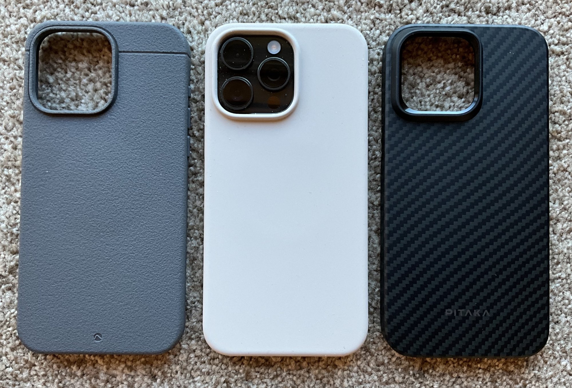 The light-colored one in the middle is an Elago Stone Silicone case purchased on Amazon for $16.50 shipped, weighing in @ 41.17g. it's actually much darker than it appears in the photos, more taupe than white. For the money it is extremely well made, with a strong magnet and stiff sides. There is a fine even mold-release line encircling the entire case mid-way between front and back, barely felt but visible, and its downsides are those endemic to all silicone cases being lint pickup and difficult pocket removal. I like the soft feel and it's a nice occasional change from the other two.