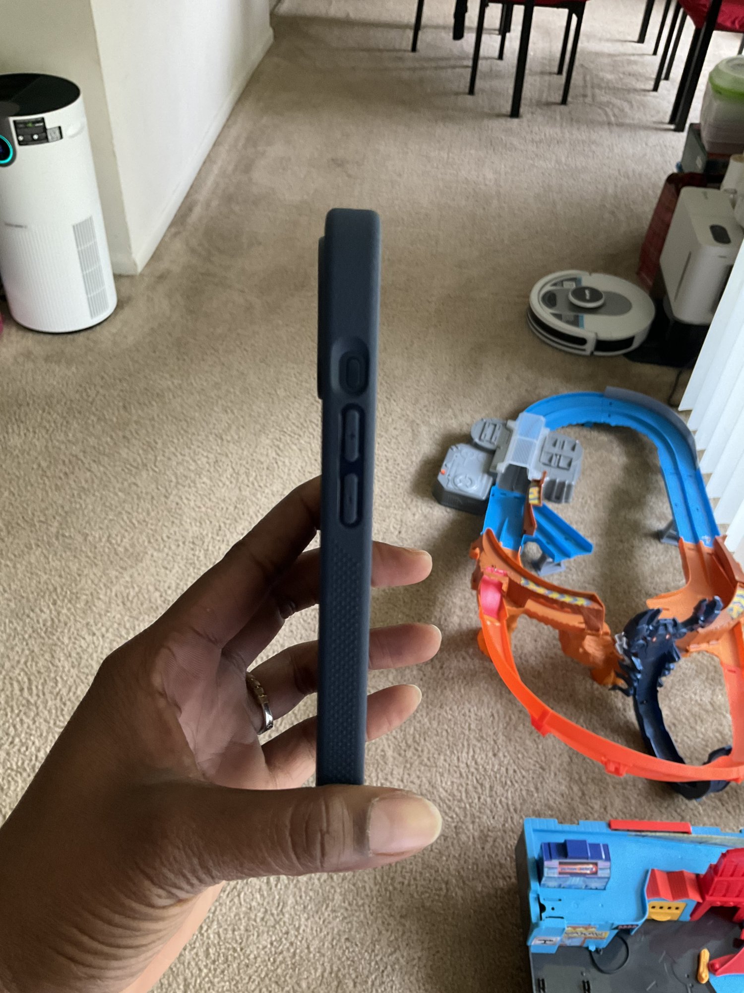 Here is a pic of my Titanium Blue in the Caudabe Celestial Blue Synthesis. The cut out is not interfering with me pressing the Action Button to activate it. I’m still going to request the updated case since it’s free.