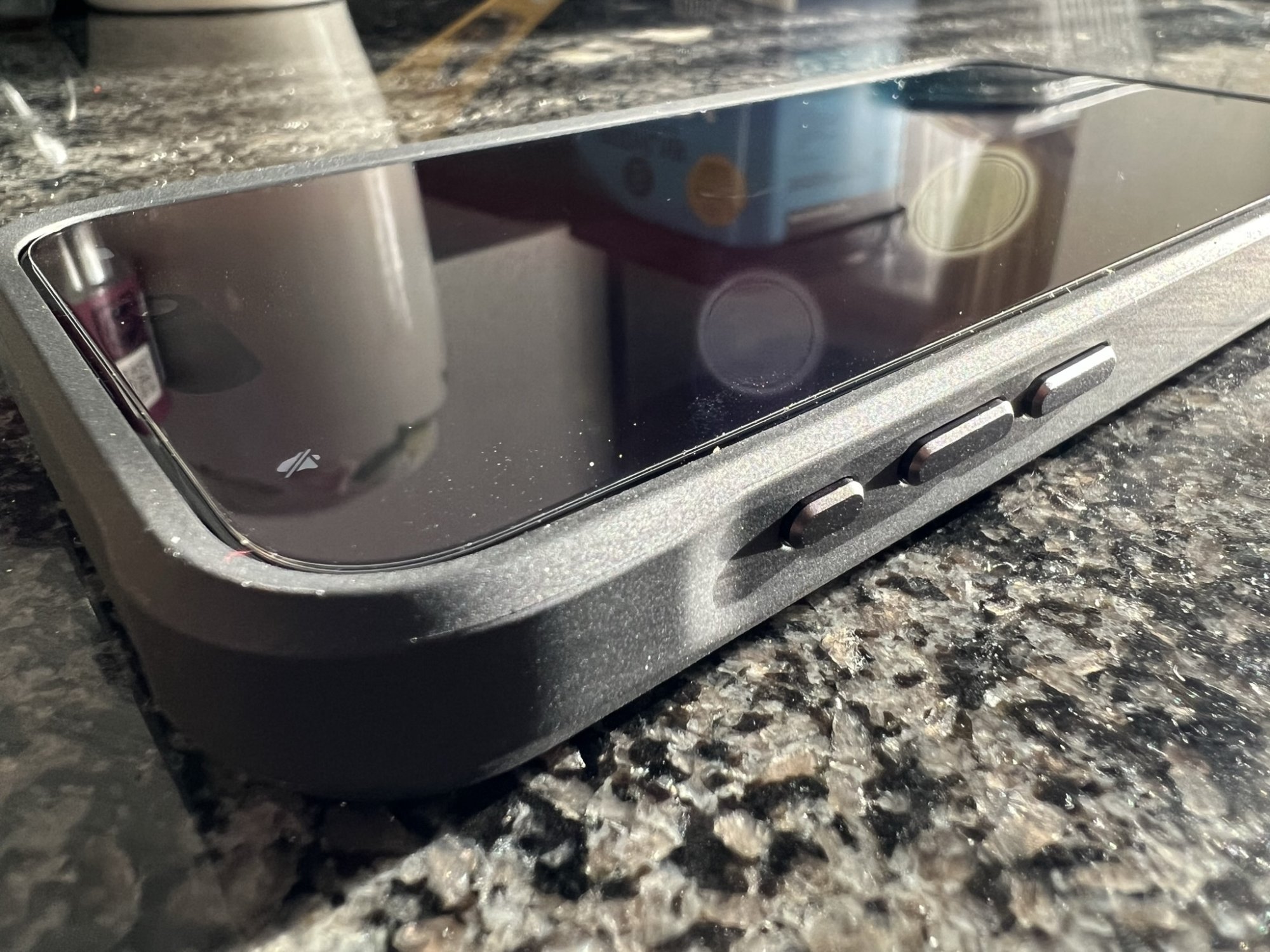 The Nomad Rugged dropped of my shortlist, because it had the same problem as the leather, but their site showed an almost 0,5 mm extra lip, compared to the iPhone 14 case, which peaked my interest again, so I ordered it. My second doubt was that the rim/edge on the back would make it impossible to place it on my charging dock, but since the Pro Max is bigger, this was no problem. However my biggest issue with this case was it is really slippery in hand, yes on the table it has a nice lip and same goes for the back, so it won't slide anywhere, but it just felt very slippery in hand. Also for some odd reason the action button feels almost non-existent when clicking it. Very odd, since I assume it should work the same as the leather case.