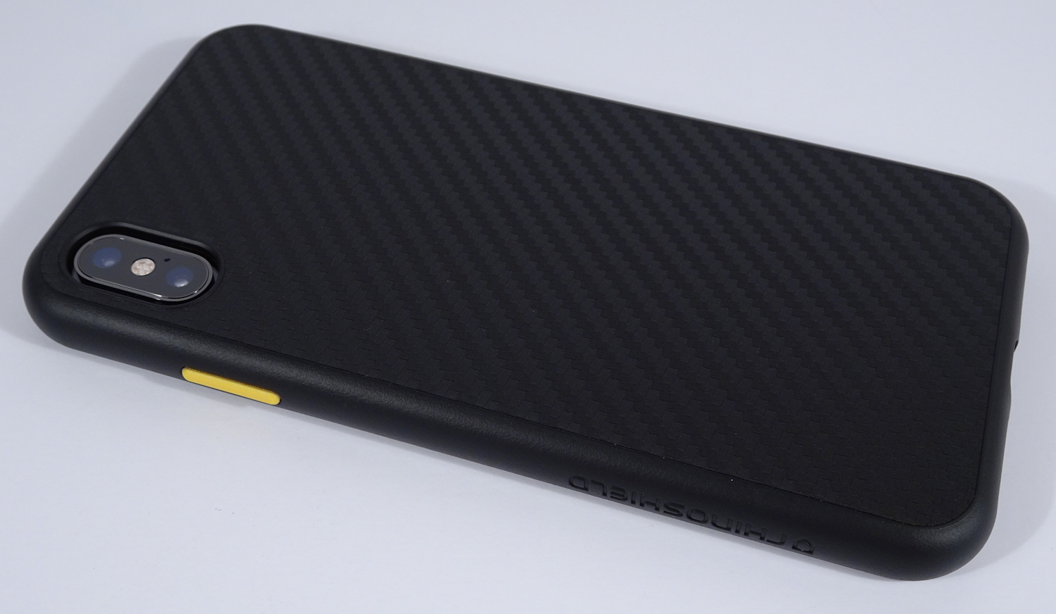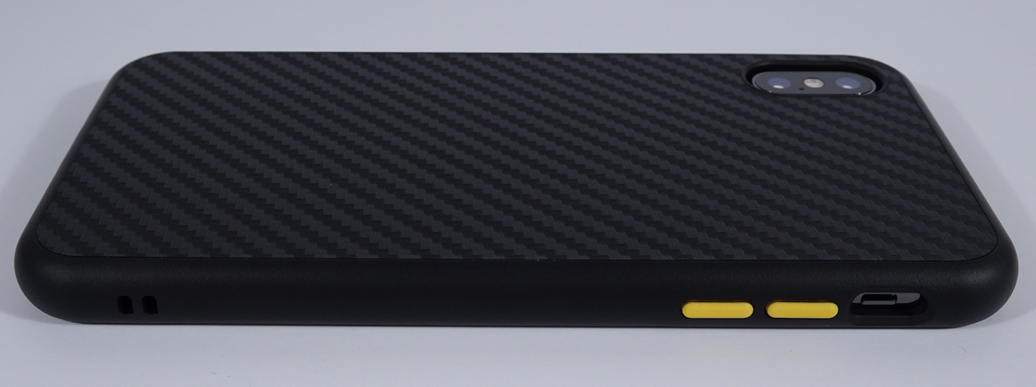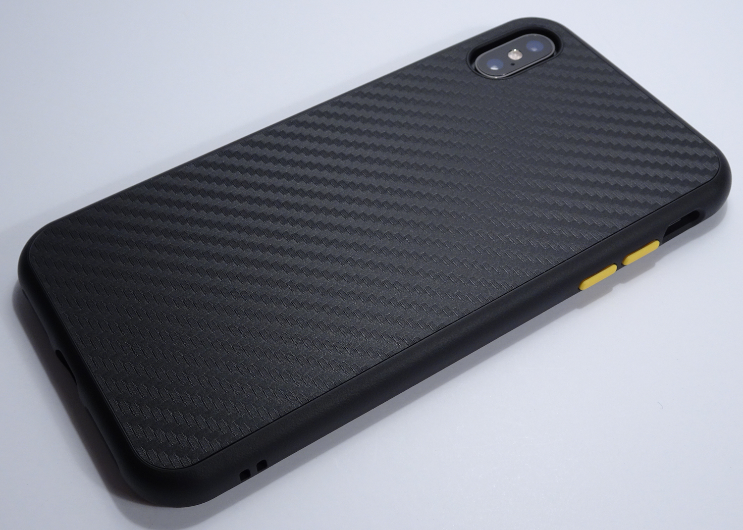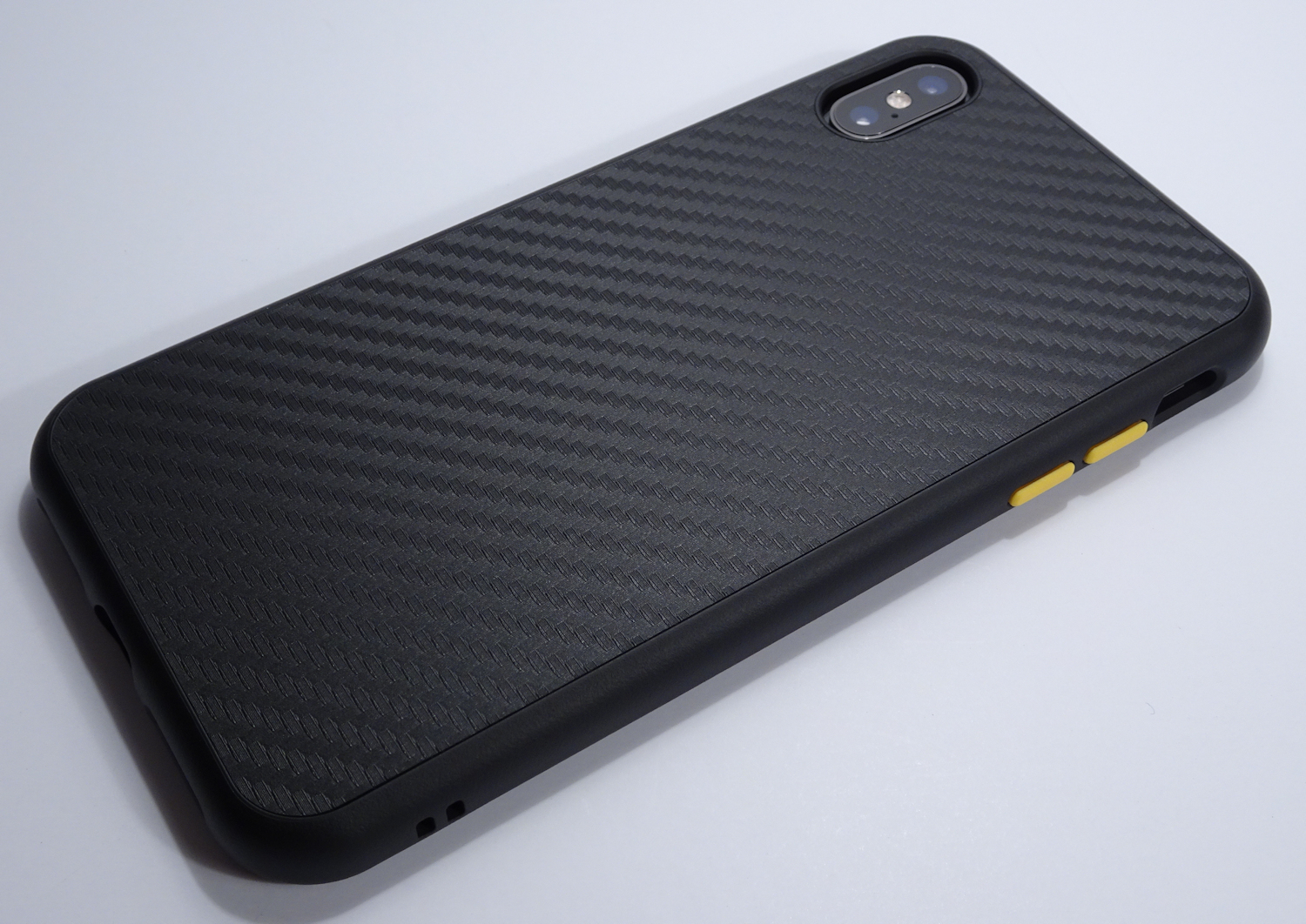 Rhinoshield Solid Suit in carbon fiber with yellow buttons. The case feels nice, fits perfect, looks great but it's slippery as a greased pig. Love the different colored buttons. Wonder if the "Leather" version would have more grip? Also don't like that the bottom grill cutouts are from last years iPhone X.