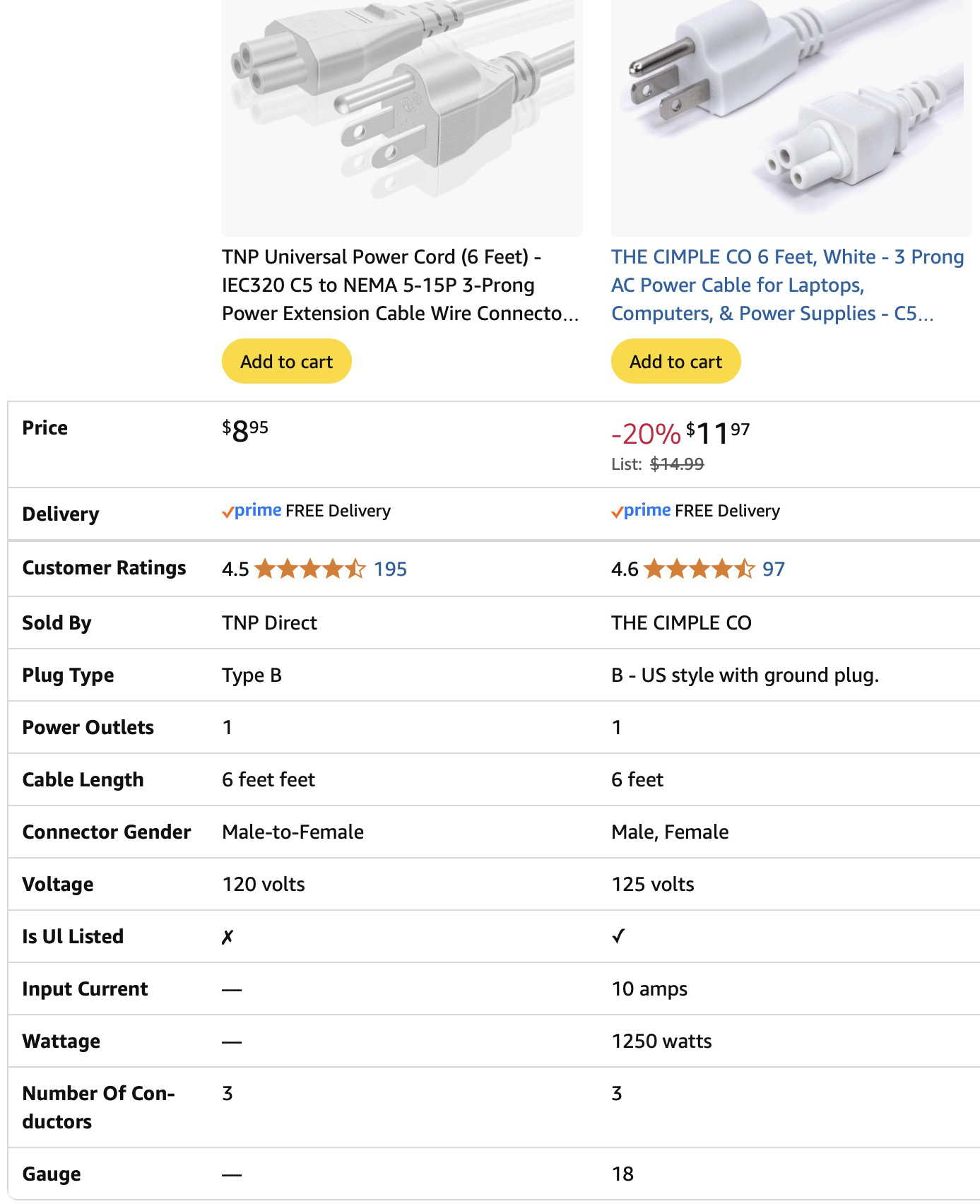 Please look at the two 6 foot cords I am contemplating. I'm not an electrician. Which would replace my M4 2024 10 core iMac (A3137) power cord. I think the cord must be a IEC320 C5 to NEMA 5-15P 3 prong, (143W Power Adapter Extension Cable), whatever it's called. One cord is rated 1250 watts. I just don't understand volts and watts to start a fire or burn the iMac up. The original power cord is 3 meters long, just too short.
