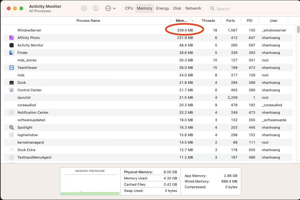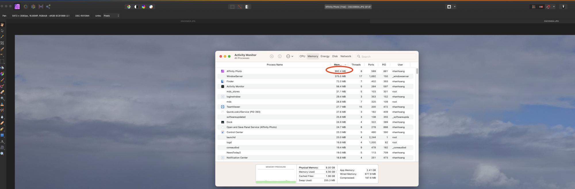 I still believe an 8GB M1 Mac Mini is more than sufficient for editing photos, just not in Affinity Photo apparently. I edited photos fine in Lightroom/Photoshop on a 2015 8GB MacBook Pro but Affinity Photo is a different story. For every 20-25MB Sony or Canon RAW file imported, Affinity Photo memory use jumps 1.5-2.0 GigaBytes! Even for a 10MB JPEG imported, Affinity Photo memory use jumps almost 400MB. This is simply importing, no editing yet, no layers, etc. This is very perplexing since Affinity Photo has very light