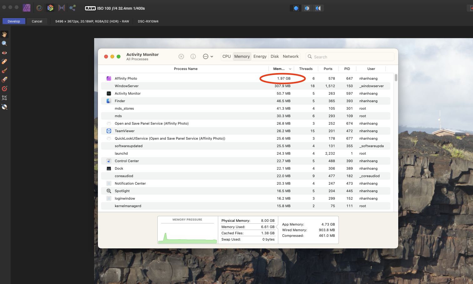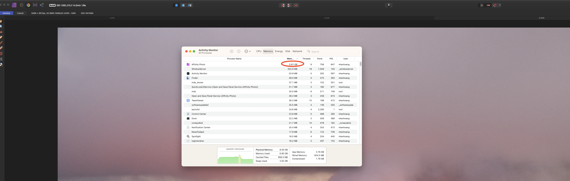 Affinity Photo after importing a single 20MB Sony RAW: