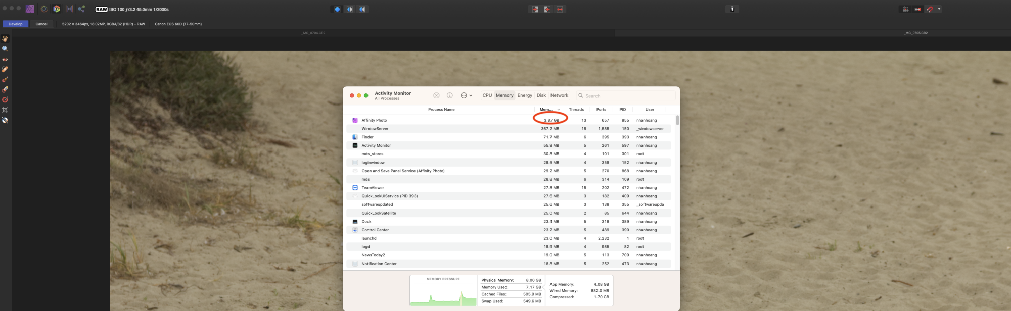 Affinity Photo restarted, import of two 25MB Canon RAW: