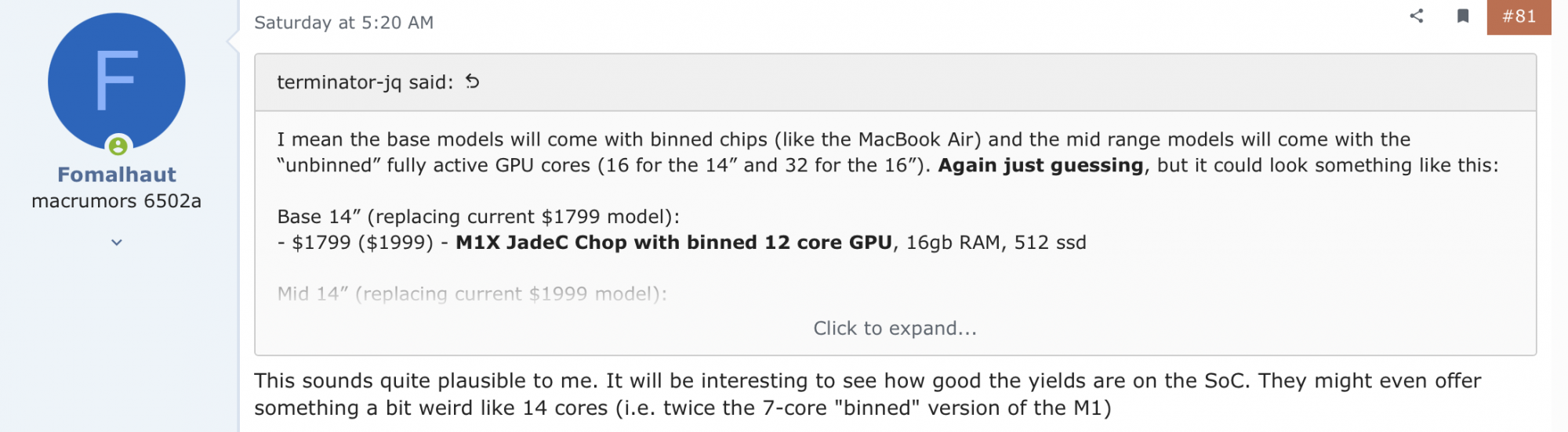 This sounds quite plausible to me. It will be interesting to see how good the yields are on the SoC. They might even offer something a bit weird like 14 cores (i.e. twice the 7-core "binned" version of the M1)