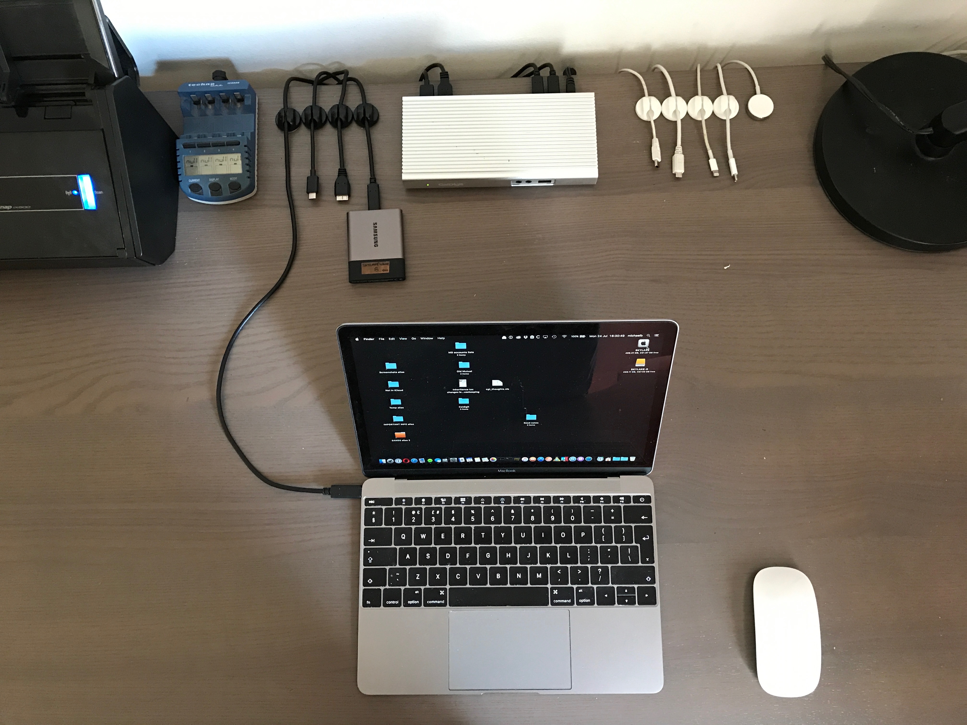 I don't use mine with a second monitor but there is a port on the back of that Caldigit Hub that I could plug one into if I wanted. And an unused USB-A port on the front of it. Three free USB-C cables (which could be USB-A if preferred). The white leads are all charging only, nothing to do with MacBook.![]()