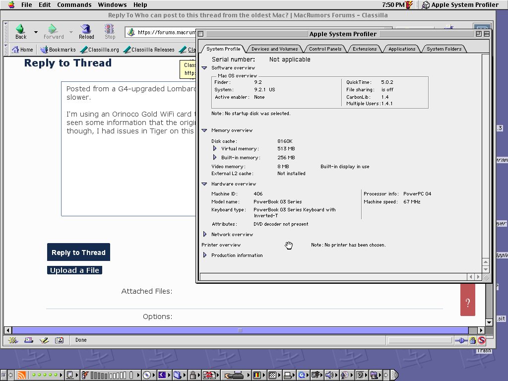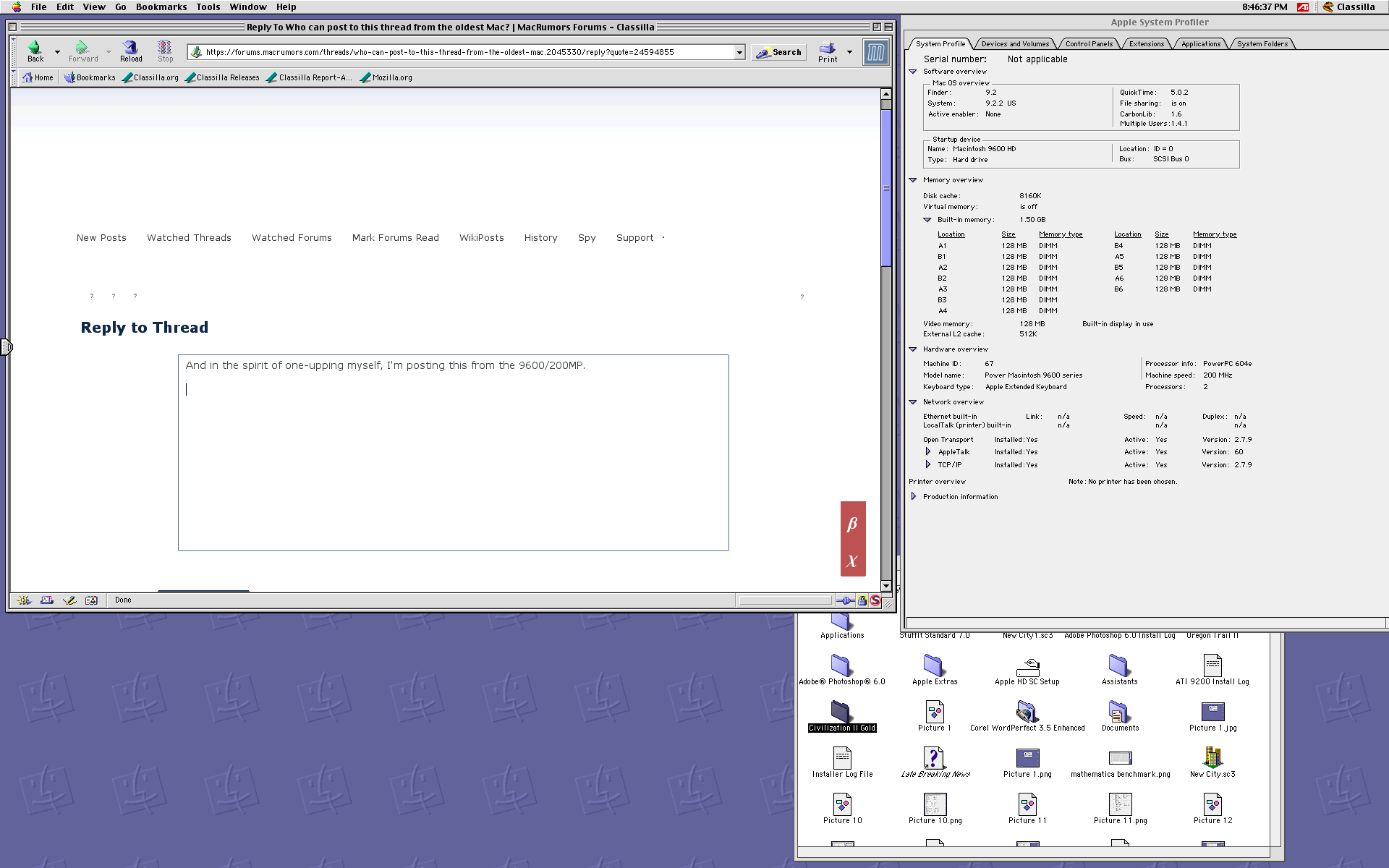 BTW, it should be theoretically possible to post to here from any PowerPC Mac since all will run OS 8.6. With that said, given how slow the 9600 was, I can't imagine a 66mhz 7100, for example.