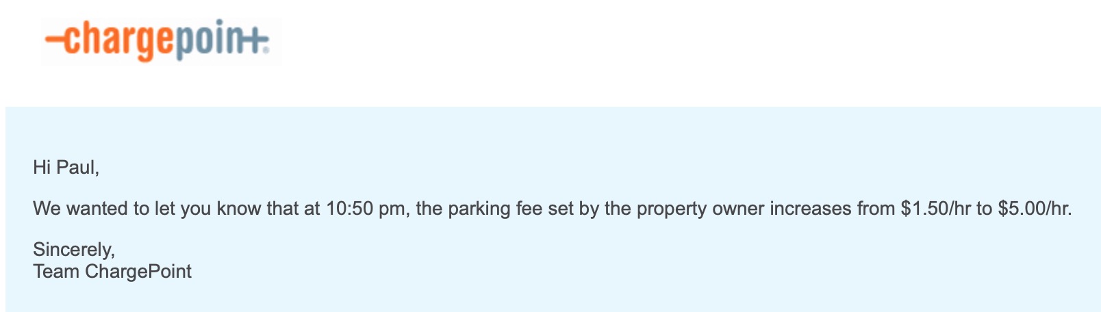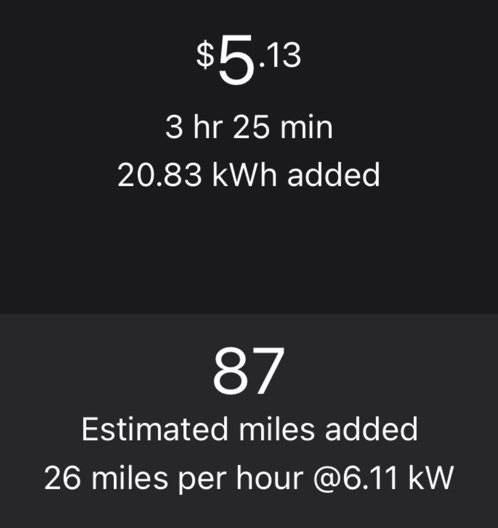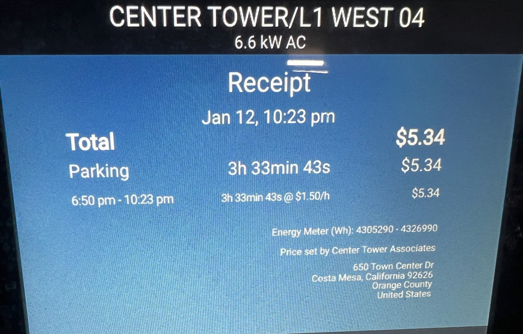 The ChargePoint stall was working so I figured why not, I intentionally came in with 54% on the battery so I could charge. It said, $1.50 an hour but after 4 hours, it would be $5/hour. Sweated it a little bit at the end there because the band kept playing way past quitting time, lol. (It was a nice concert!). I believe the car was at 87% if I remember right when we left.