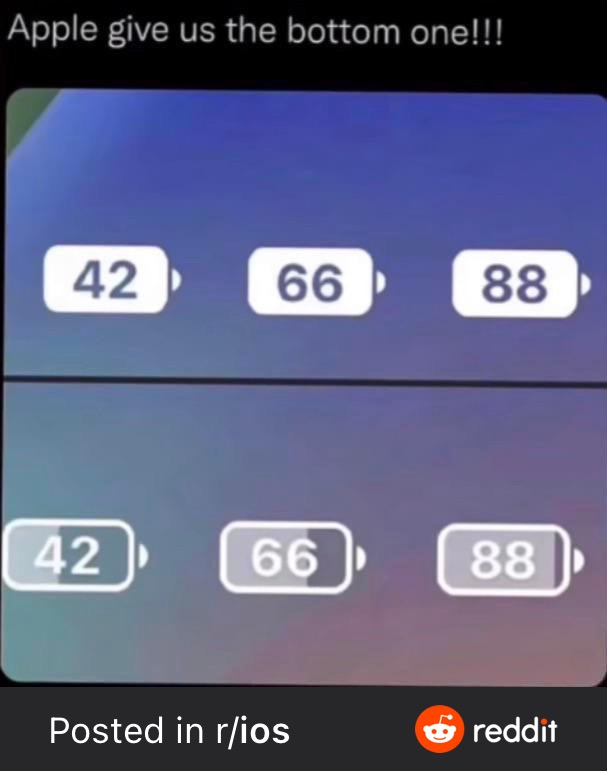 Apple have just done the bottom ones in the new 16.1 beta 2 releaseBattery percentage needs some sort of graphical representation too something like this