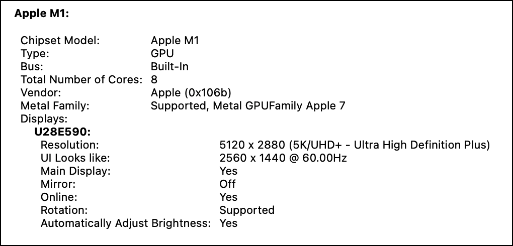 I’m not tech savvy, but how does a 4K monitor display 5K?My "base" M1 Mac Mini is currently rockin' a 28" Samsung U28E590 display at 5120 x 2880 @ 60Hz via HDMI-2.1, leaving both USB-C / Thunderbolt-4 ports open for external storage. My monitor has two HDMI inputs -- one is 30Hz and the other is 60Hz (with a compatible cable). I assure you the Mac Mini has no problems driving this gorgeous 5K display smoothly at 60Hz via its HDMI output.