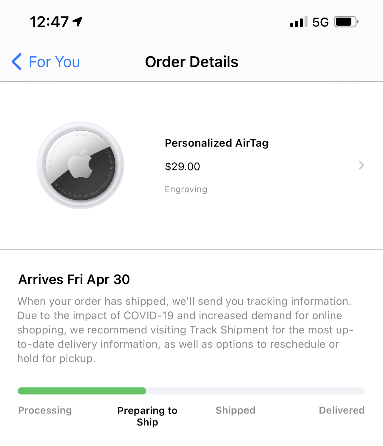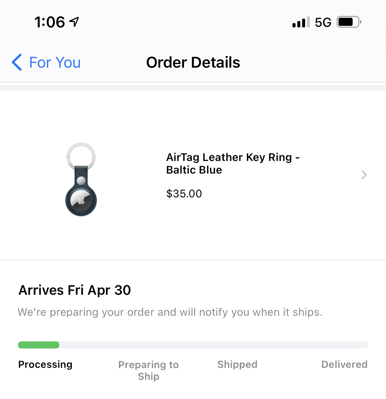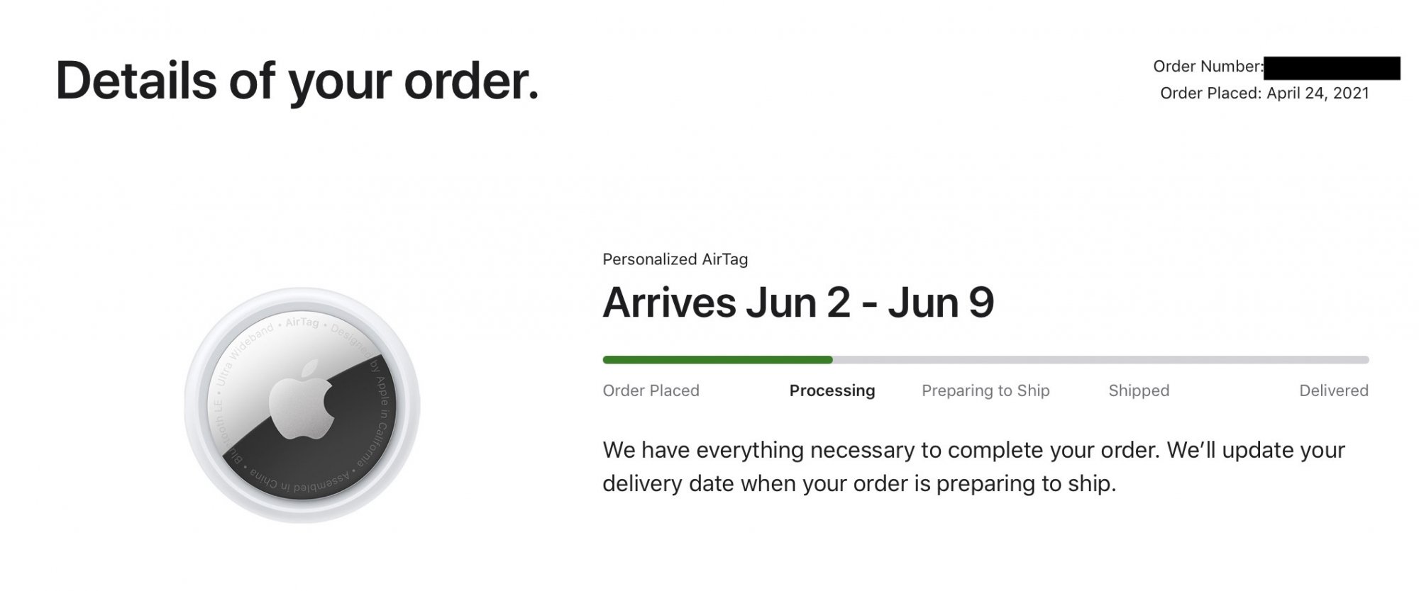 I ordered a 4 pack (not engraved) and a Belkin holder 3 minutes in and they are still processing. I only see the charge for the AirTags on my card and nothing for the Belkin holder. Maybe that’s why? Thankfully the arrival date is still April 30.
