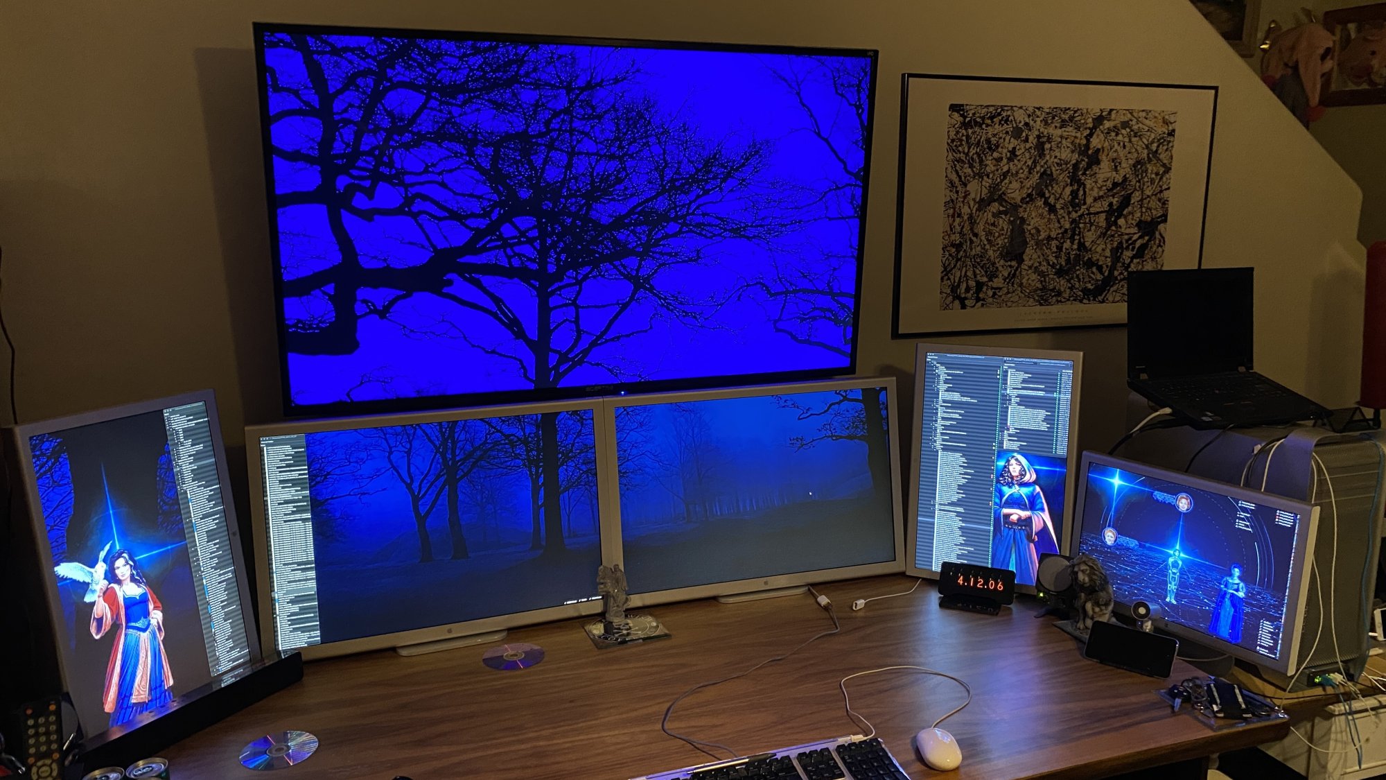 Oh that's a really cool setup 🤩.. Almost looks like a window! the big display up top.. nice minimalist painting on the right too..