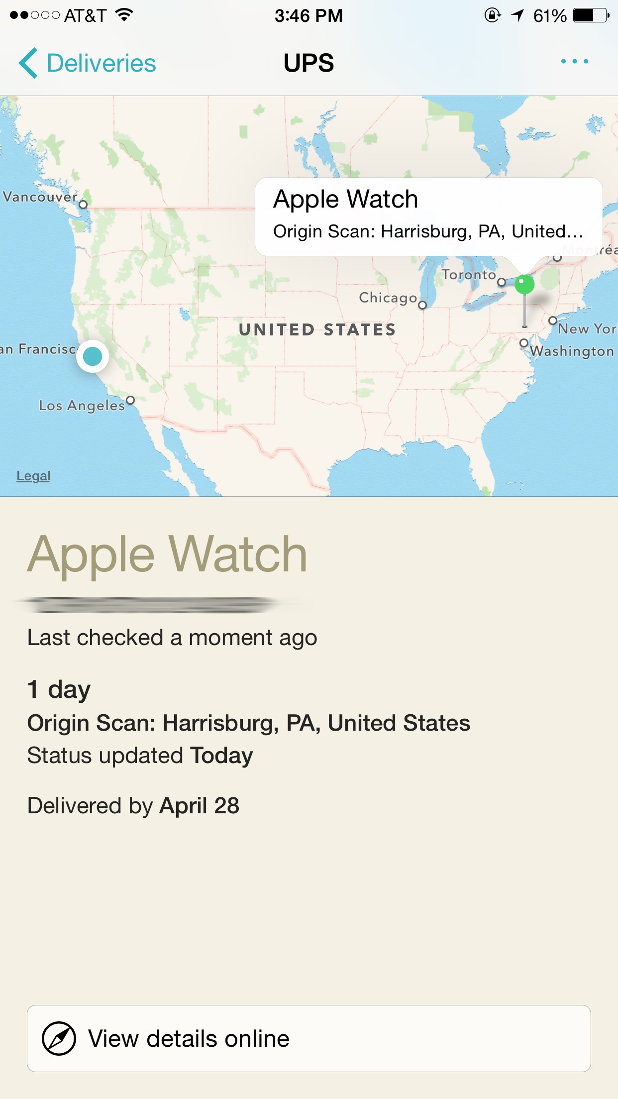 The email I received from Apple this evening said the watch would arrive tomorrow. However when I click on the link for the UPS shipping it just says the package is in Harrisonburg Pennsylvania with no ETA .