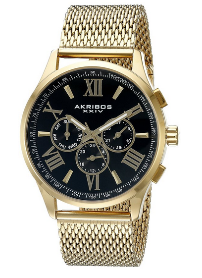 Akribos XXIV Men's AK844YGB Round Black Radiant Sunburst Dial Two Time Zone Quartz Bracelet Watch