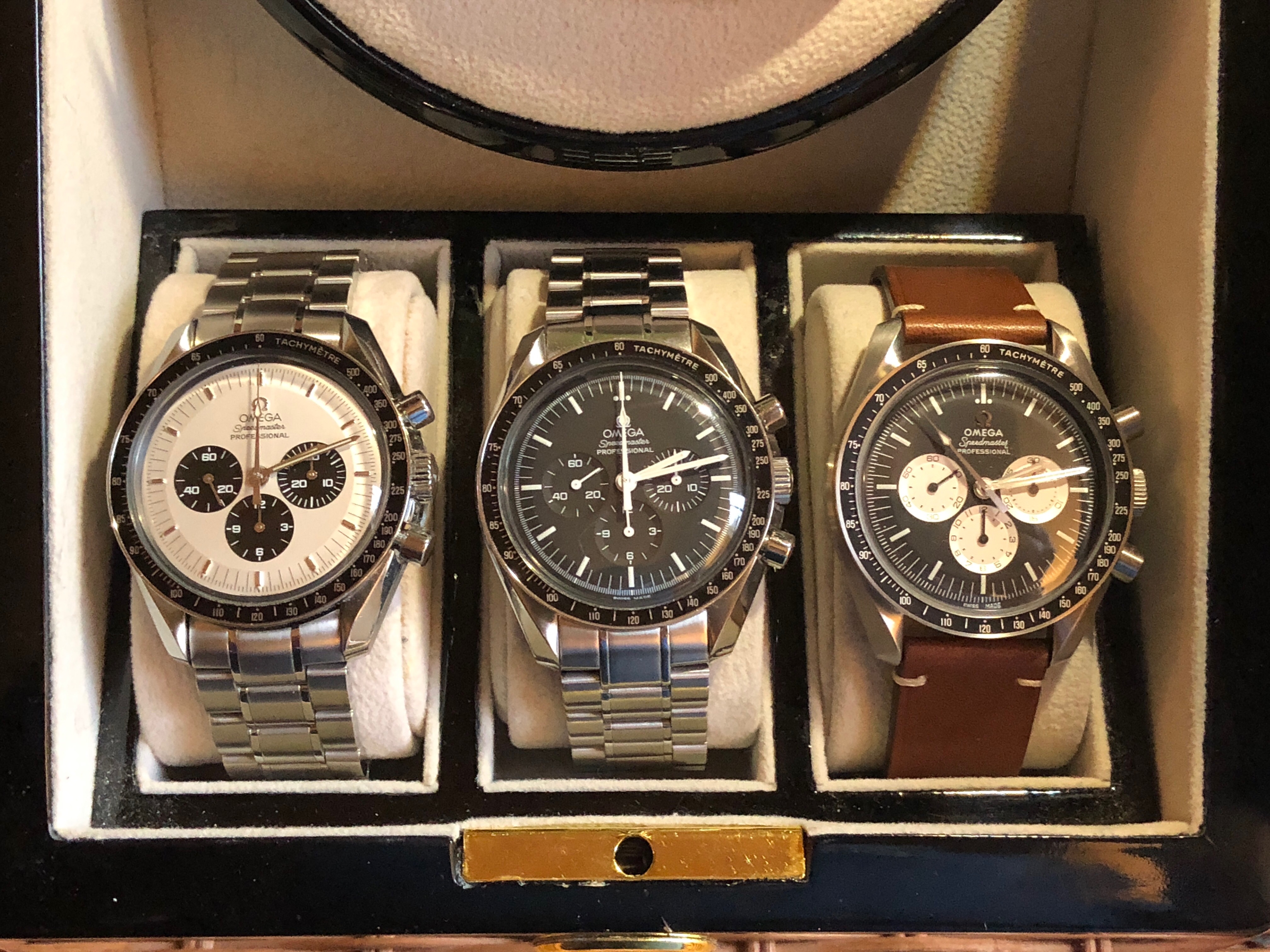 Of these Omegas, I've only sold the orange bezel Planet Ocean and the Snoopy Speedmaster, but I added an Omega Speedy Tuesday, a 2013 Speedmaster 3570.50 and a 2005 3572.50 which I modded with a white panda dial (I had two Grey Side of the Moon, planning to give one to my son for graduation but sold).