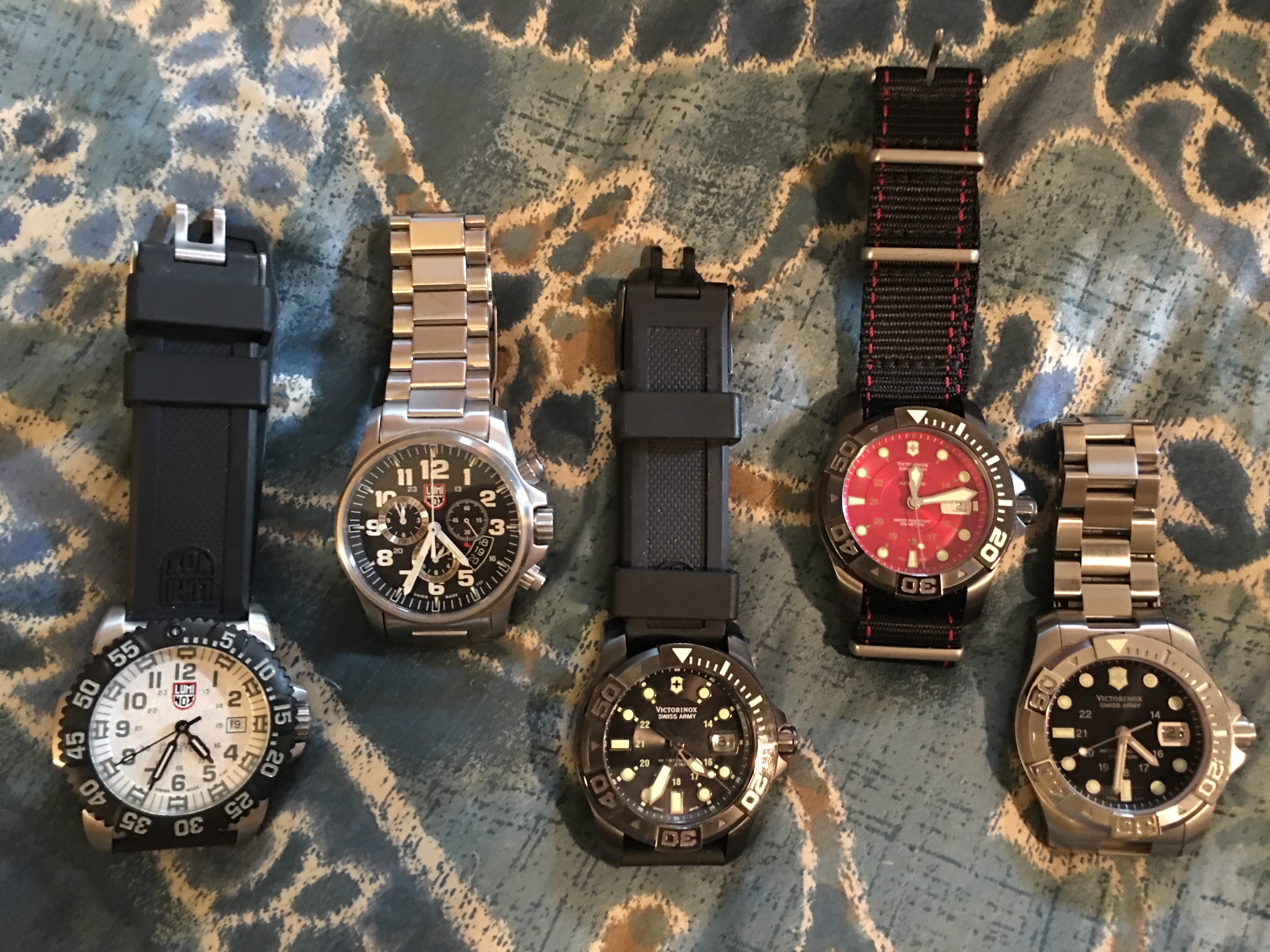 A few of my Luminox and Victorinox Swiss watches that I still have. I have two more Luminox (a carbon cased diver and a blue dial chronograph) not pictured.
