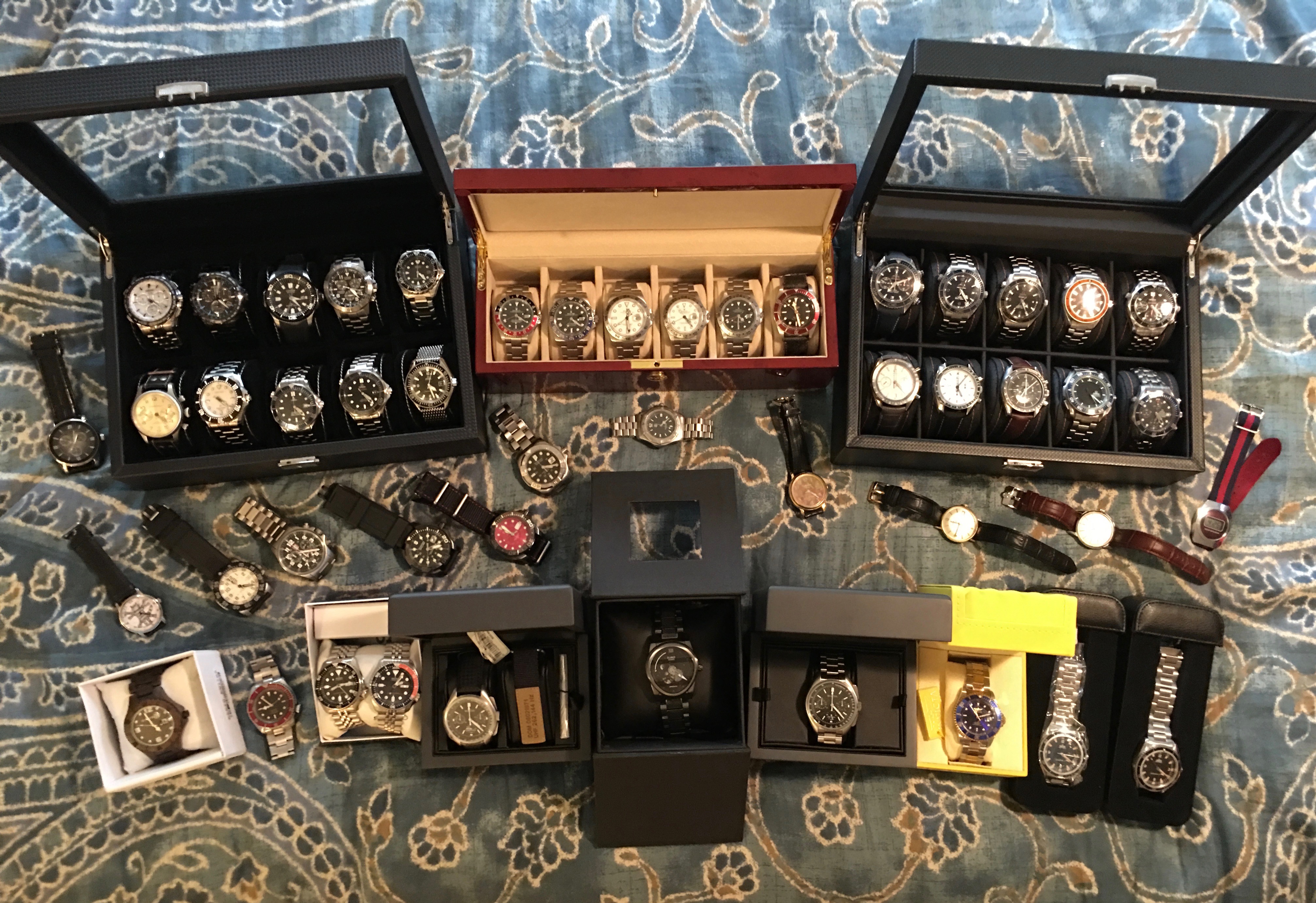 This was the shot of the whole collection at the time, which has changed and grown. Notice two Bulova Apollo 15 Moonwatches, on strap and bracelet.