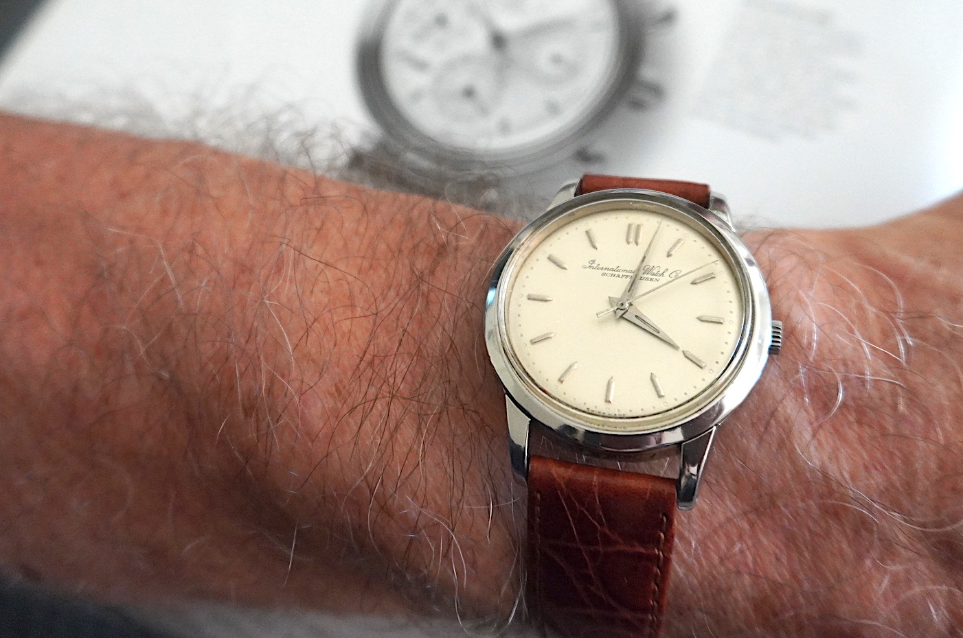 Very elegant and versatile watch. I wish more dress watches today would go back to this case size. In general, all modern IWCs are too big for my wrists, especially the Aquatimer and Ingenieur lines. Omega did some Seamasters with similar case designs to this in the 50s, and I would love to own one some day, but need to do more research as they came out with many references with small differences.