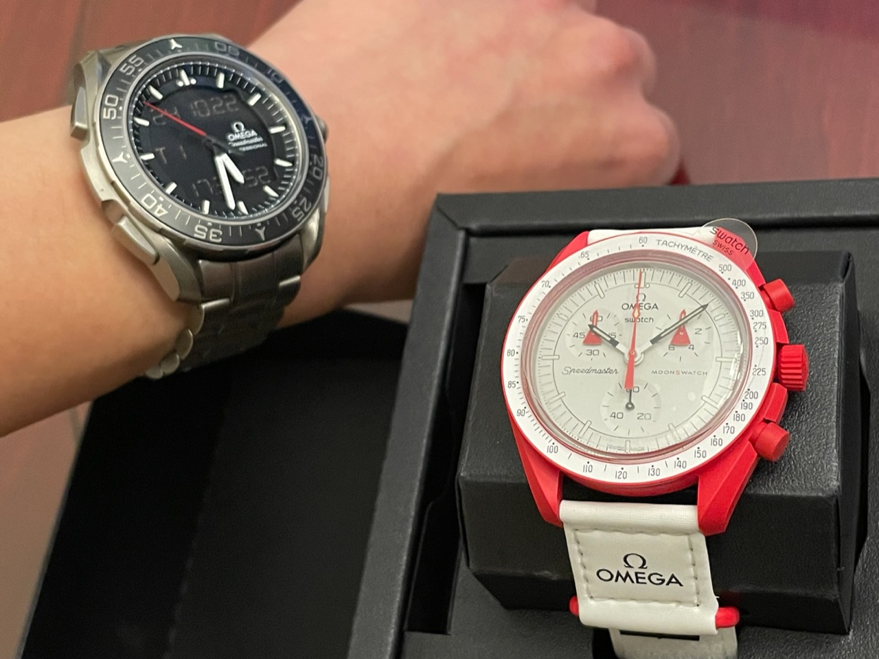 View attachment 2101432Not a nice watch from a quality perspective, in fact by far the worst watch I own; but based on the hype around the Moonswatch you’d think it was. I had tried finding it at the New York and Las Vegas boutiques earlier this year with no luck, but happened to be in Vancouver this last weekend and they had almost all the Moonswatches at the Metrotown store. I only got the Mission to Mars because it’s my favorite out of all the designs, being inspired by the Speedmaster Alaska Project, and also the only Moonswatch with lumed chronograph hands. For such a cheap watch, it actually has a pretty interesting movement. The chronograph is accurate to one-tenth of a second and it also has a zero-reset when the crown is pulled. Here it is next to a watch that has actually been used in space, and also the one I was wearing this weekend.