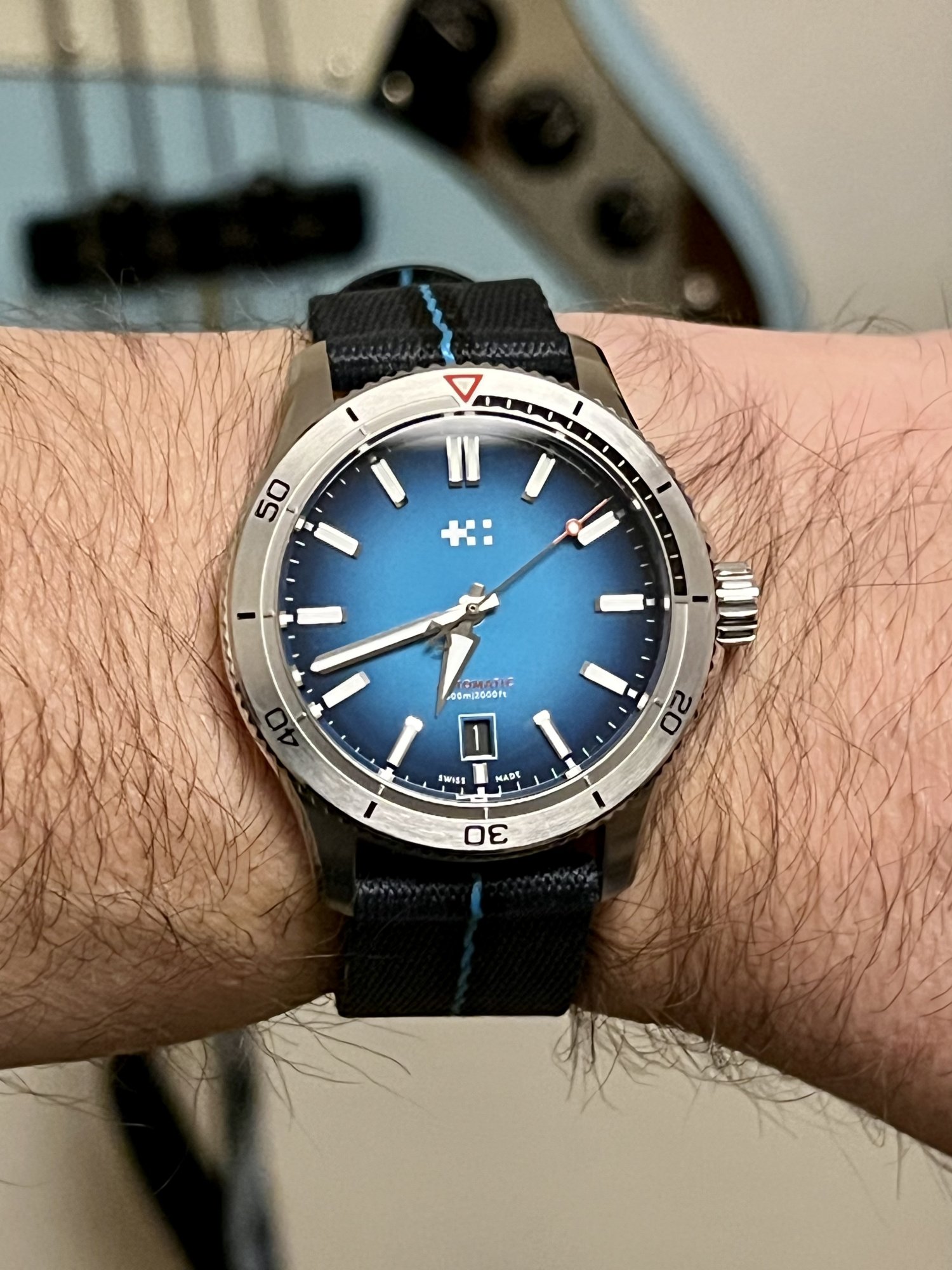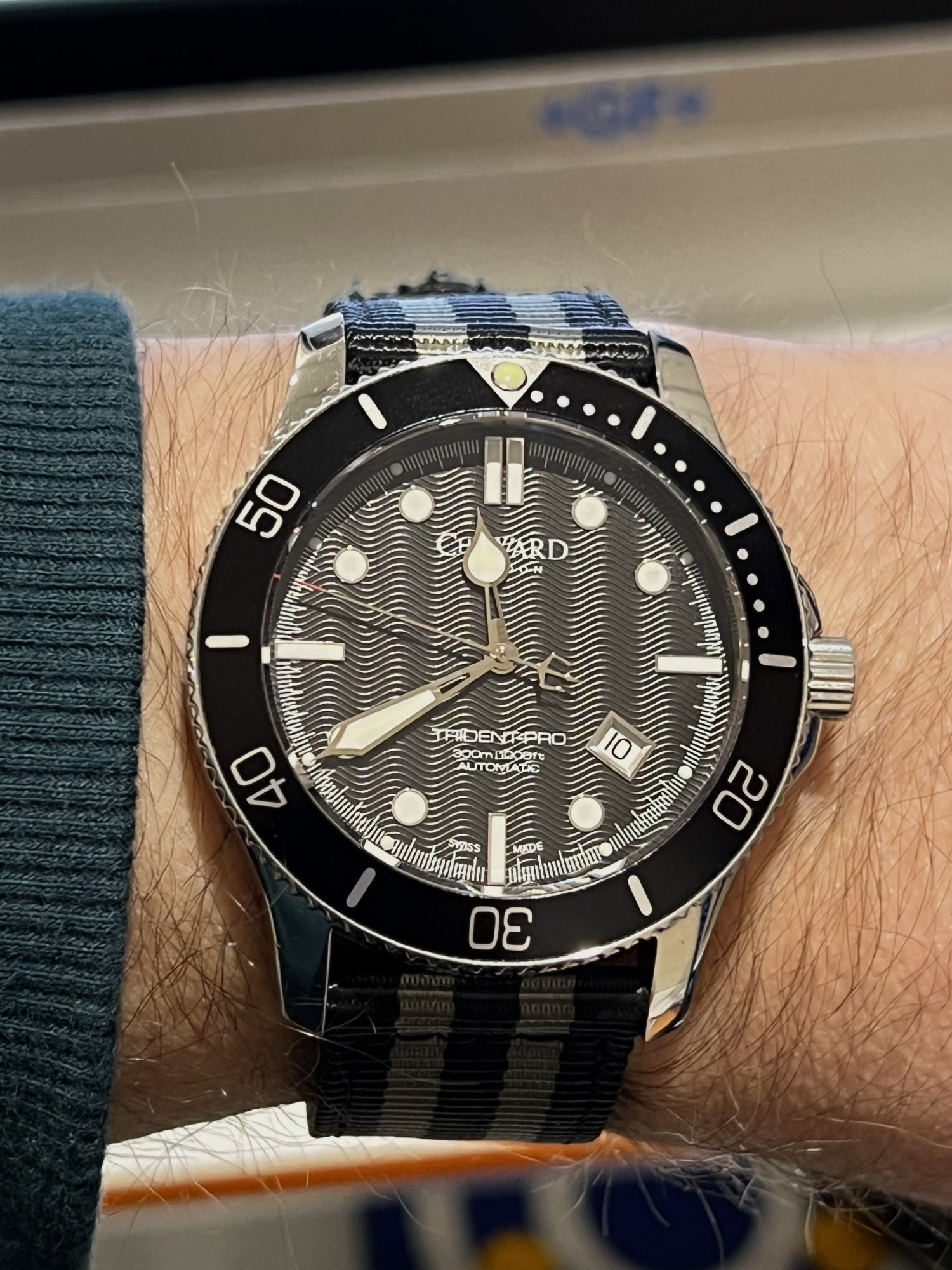 The watch is a limited edition Christopher Ward C60 Atoll with a stunning fumé dial.