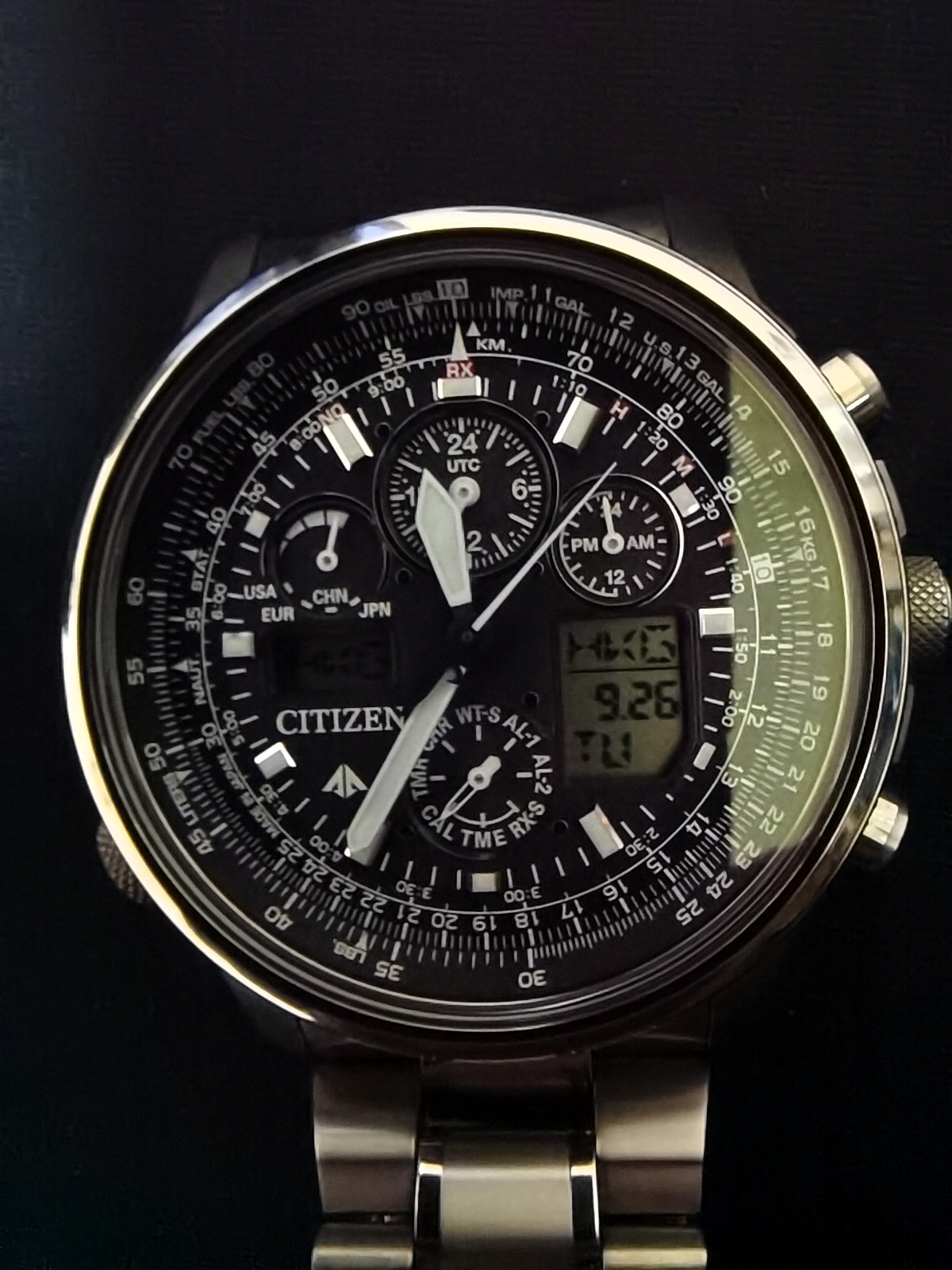 Your Citizen Promaster Sky, a very nice watch! Although as you say - with a busy dial, which I like and which drove me towards a Citizen Blue Angel World Chronograph. True, setting them up first time is rather a pain, after which atomic timekeeping takes over.Citizen Promaster Sky (PMV65-2271, U680 movement, JDM model) - While I've looked to avoid harsh use with my mechanicals the Promaster has been worn with complete indifference to wear & year.