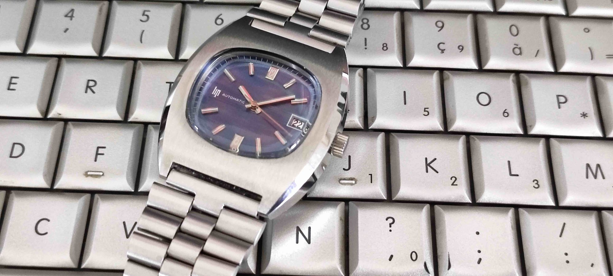 So not surprisingly LIP watches fascinated me, and I was keen to purchase one, preferably a vintage model. My idea was to buy one as a present for my son, but first I had a dilemma. Unlike myself he doesn’t like used/second-hand goods. Lip today have a large range of quartz models which don’t particularly appeal to me, and their modern auto mechanical models imho lack that je-ne-sais-quoi. I believe some of the more expensive auto models tick with the Seiko Time Module NE86 movement installed, although they wouldn't acheive my goal of offering a traditional LIP, so I set out to find a vintage auto model, aesthetically pleasing and if possible a NOS example. After a few weeks of research and on-line searches I found one I especialy liked and thought would please - a Duromat model, date circa 1970 (photos below). The seller had a family member who had been associated with the LIP factory in Besancon and had an interesting collection.