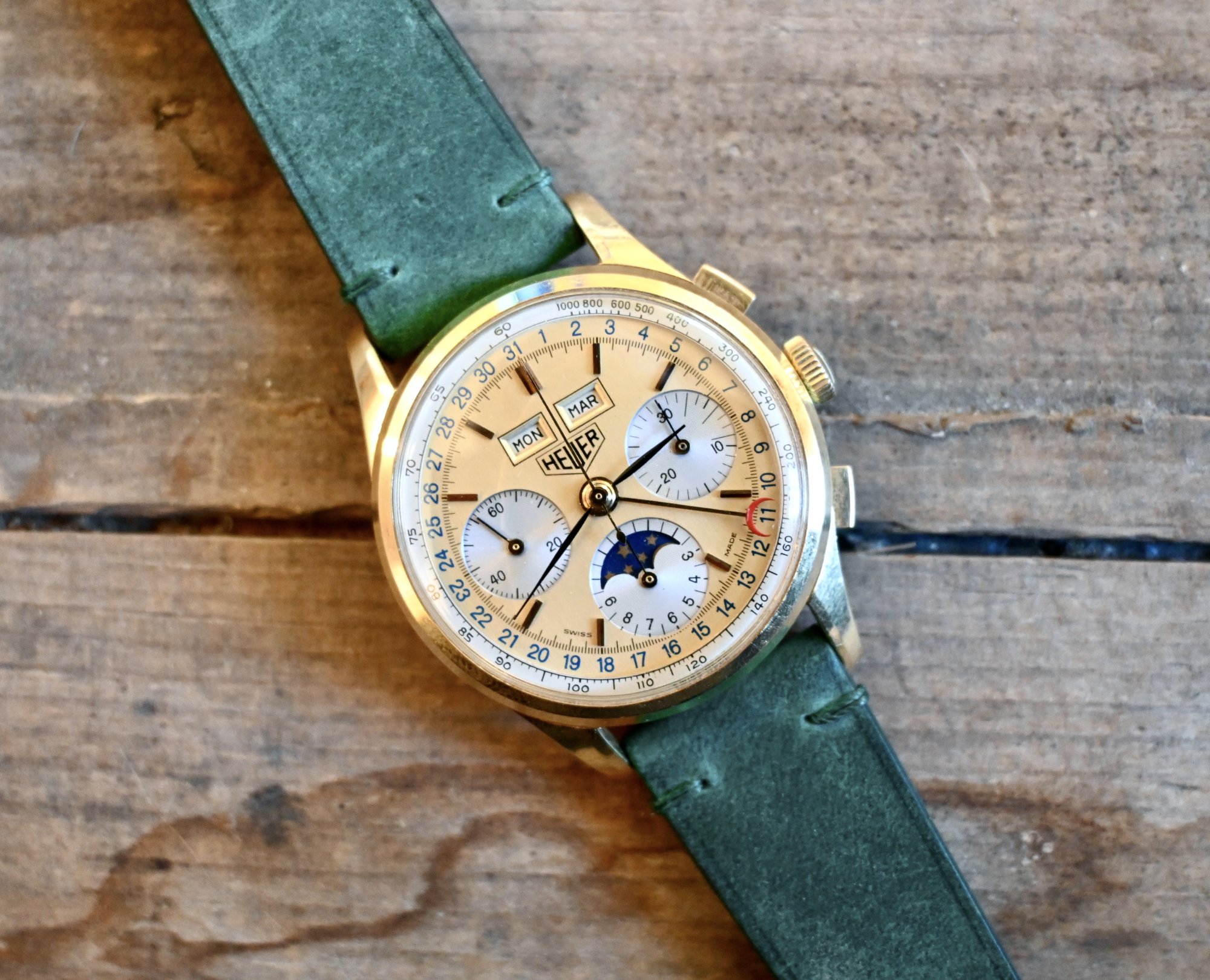 Just added this gorgeous 70s Heuer "Golden Hours" (solid 18K yellow gold) to my collection. Technically it is for sale (I do deal in vintage watches), but it will likely end up staying. Manual wind Valjoux 88 movement (Valjoux 72C base with moonphase added to it). A real PITA to set when it's sat for a while!