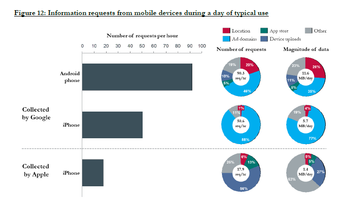 When you use your iPhone it sends a surprising two-thirds the amount compared to android phone. Half was sent to Google directly (even when iPhone is not using any Google products)