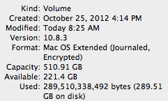 Right click on hard drive --> get info: 289GB used