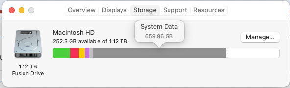 When you go to the Storage section in "About This Mac", you get a bar chart that supposedly shows how much of the storage is taken up by each type of data. I attach mine, which supposedly shows I've got 659.96GB of System Data. Can this possibly be right, especially as yesterday the same bar chart showed I had only 500GB of System Data!