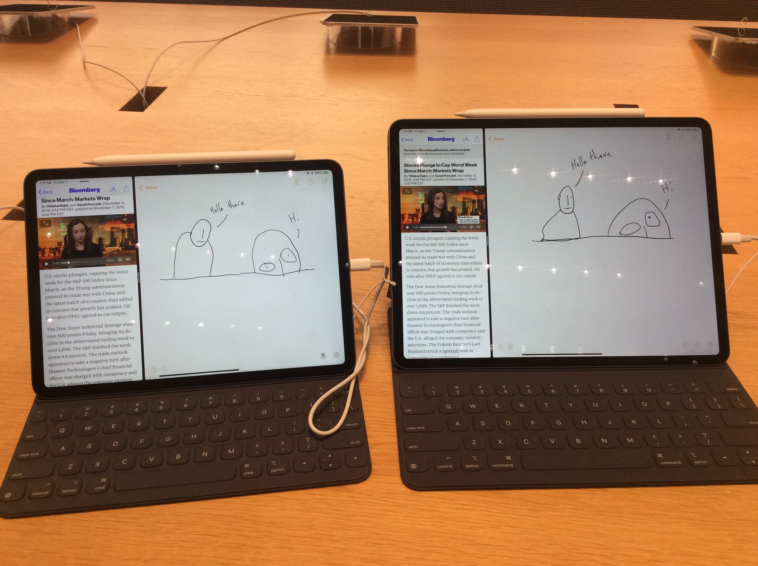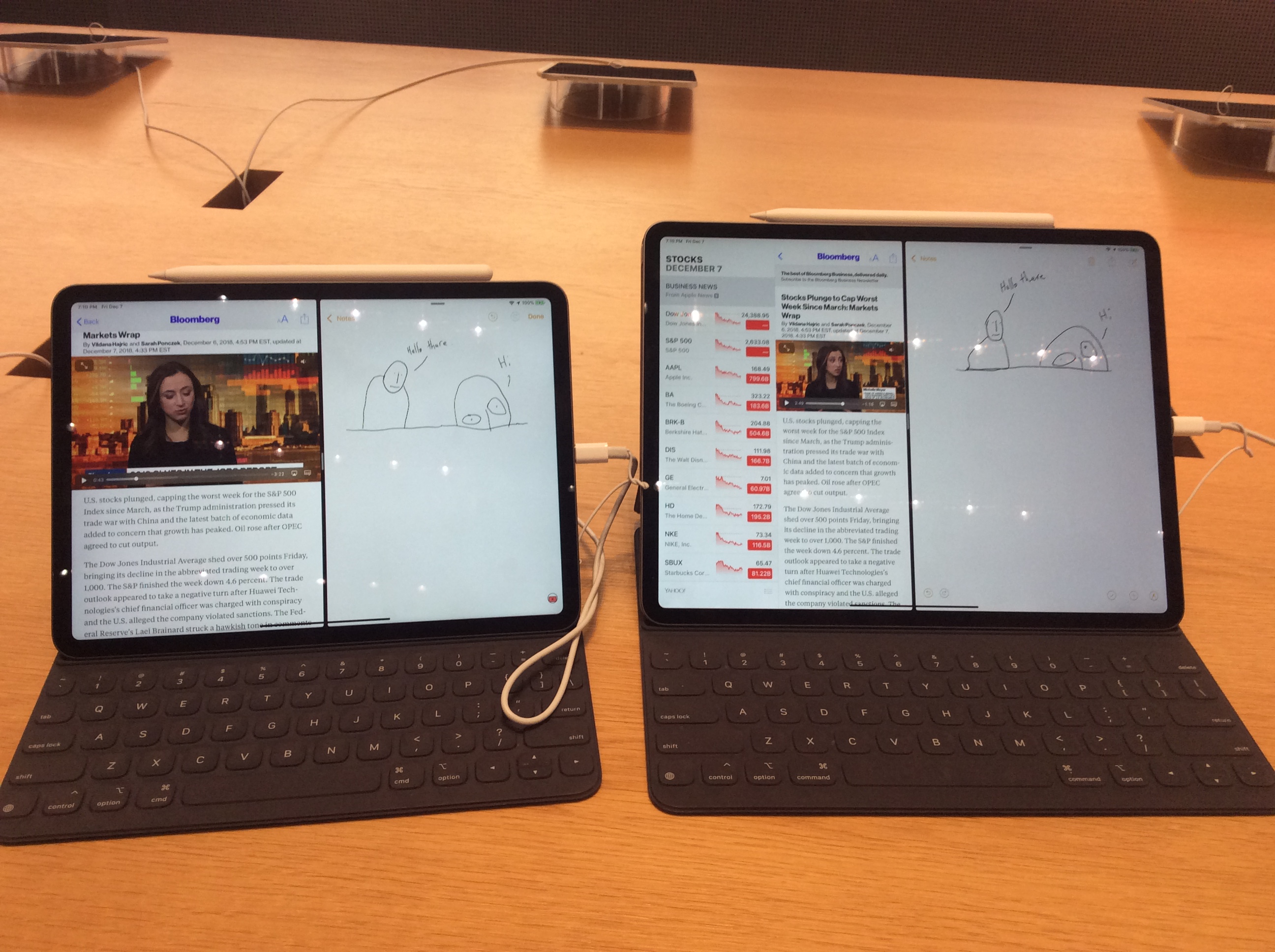 Anyway, back to the point of this thread. The split screen. Attached to this post are some pics of the 11” & 12.9” side by side. I have the apple stocks app open on one side and notes on the other with a little doodle. What i like about the 11” is that even tho it doesn’t show as much info in the stock app in some views...the type is actually bigger and more readable in both the half view & 3/4 view. The video is also bigger because of it. I like that. If i want to see the stocks, all i have to do is expand the size of the window or hit the arrow in the upper left corner. Easy peasy.