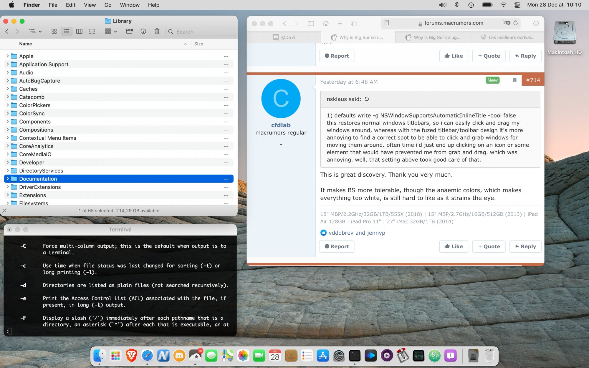 From the screencaps I'm seeing, there doesn't appear to be much you can do to customize Big Sur. I can't even notice the differences from stock to what you have, NSklaus. Even with my very high sense of awareness and ability to notice any little change, it still looks like Big Sur to me.