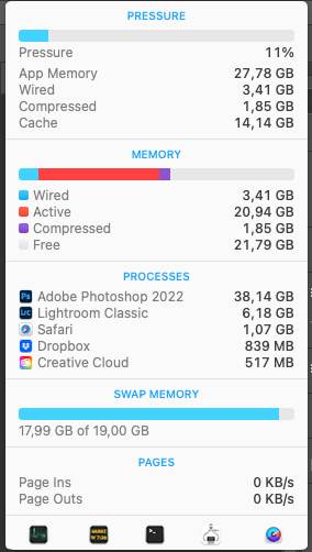 That memory pressure is so weird in that it weighs system speed the most. 38GB used by photoshop along with a whopping 18gb swap and only 11% pressure. The OS rather page out tens of gigabytes onto the SSD, potentially shortening its lifespan vs alerting the user that memory is running low and swap is being relied on so heavily.