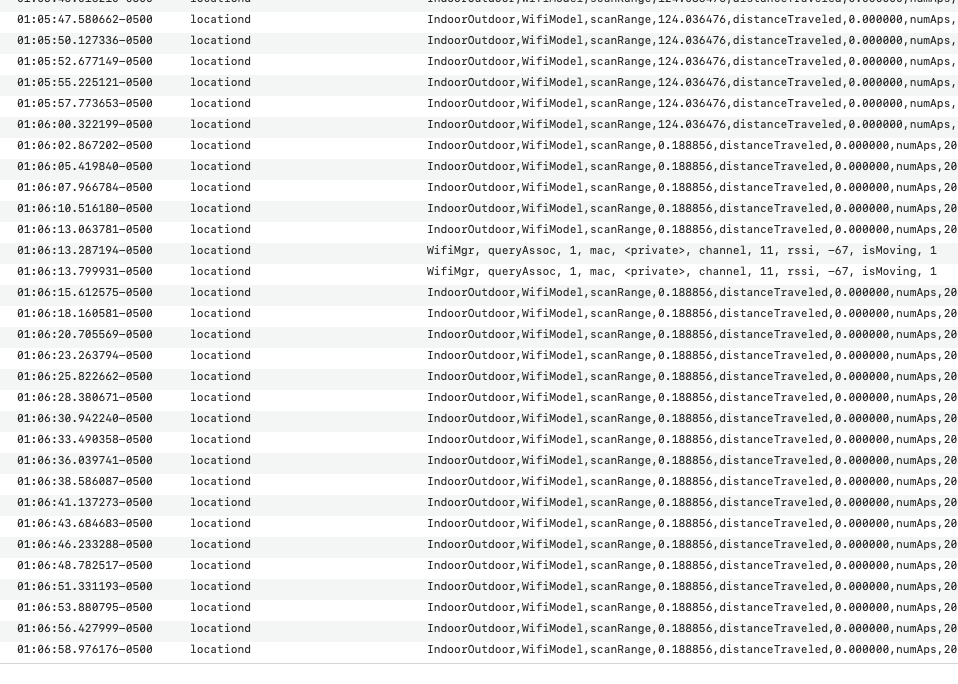 Speaking of location data, Apple not only uses BSSID via crowdsourcing to help determine locations but iOS also uses the network's RSSI as a way to determine movement. With a high enough resolution and monitored frequently enough (every 2 seconds as you can see in console) the change in signal strength from the router to the iPhone will indicate movement by the user as the signal strengthens and degrades. Again the iPhone is locked.
