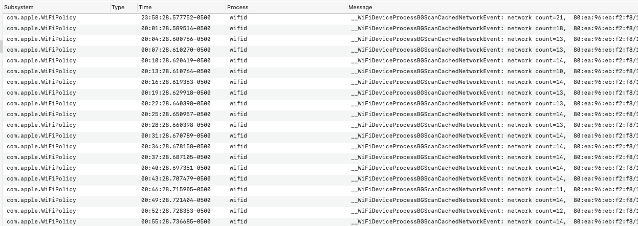 So if I disconnect the router and turn off wifi I can see iOS's wifi daemon pull and scan local network device BSSID's right out of thin air in console while I have the iPhone locked. This data can be used for trying to find a preferred network and location information....