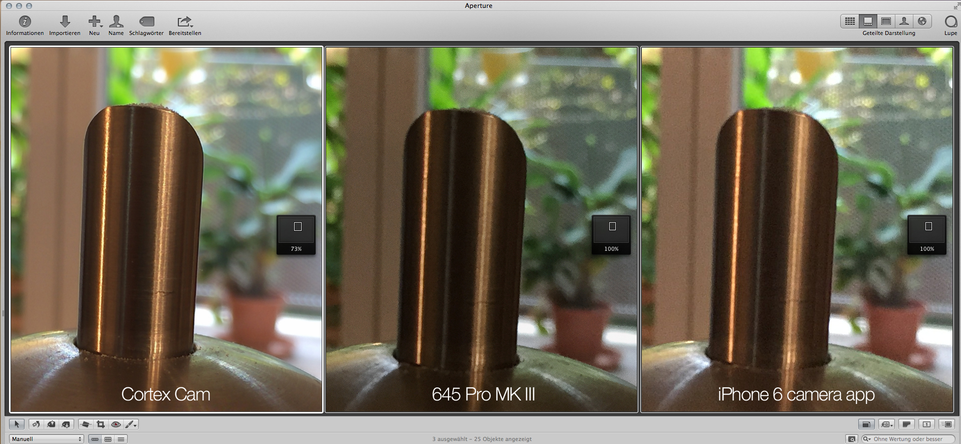 Here is a comparison in image quality (low-light situation) of the Cortex Cam App, 645 Pro MK III and the default iPhone 6 camera app.