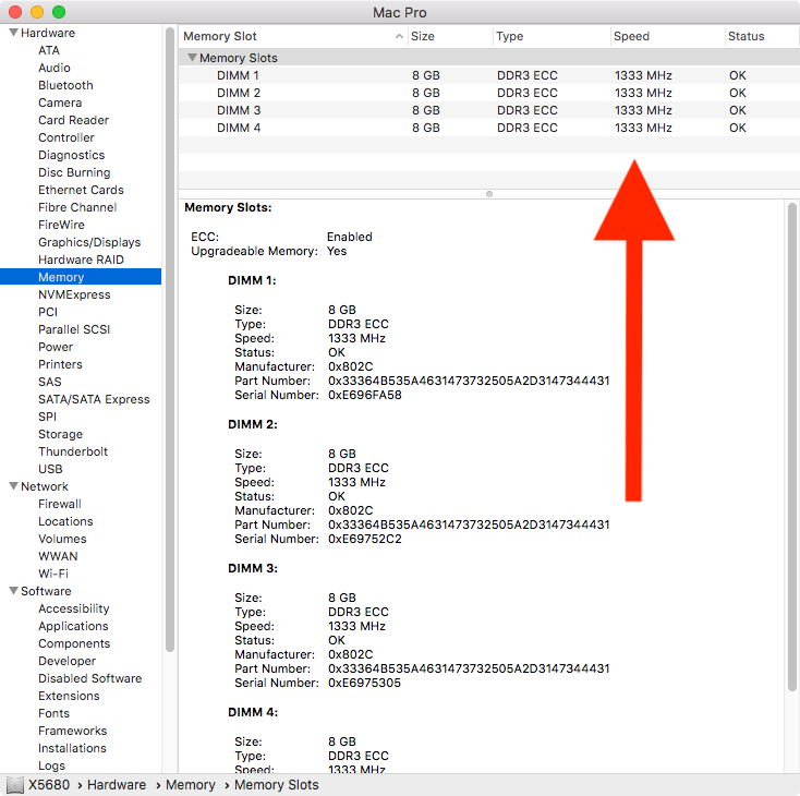 Originally a single Quad 2.93GHZ Nehalem. I flashed it to a 5.1 and installed a Xeon X5690 3.46GHz 6 core processor. All this went well, but as I understand, the MP (with the upgraded processor) should now be reading the memory as 1333MHz, rather than the 1066MHz. Also, each stick is 16 gigs. I have four of them for a total of 64 gigs. I tried it with only 3 16Gig sticks, and it still halved the ram. The ram I'm using I harvested from a computer of my dads. It is the following: