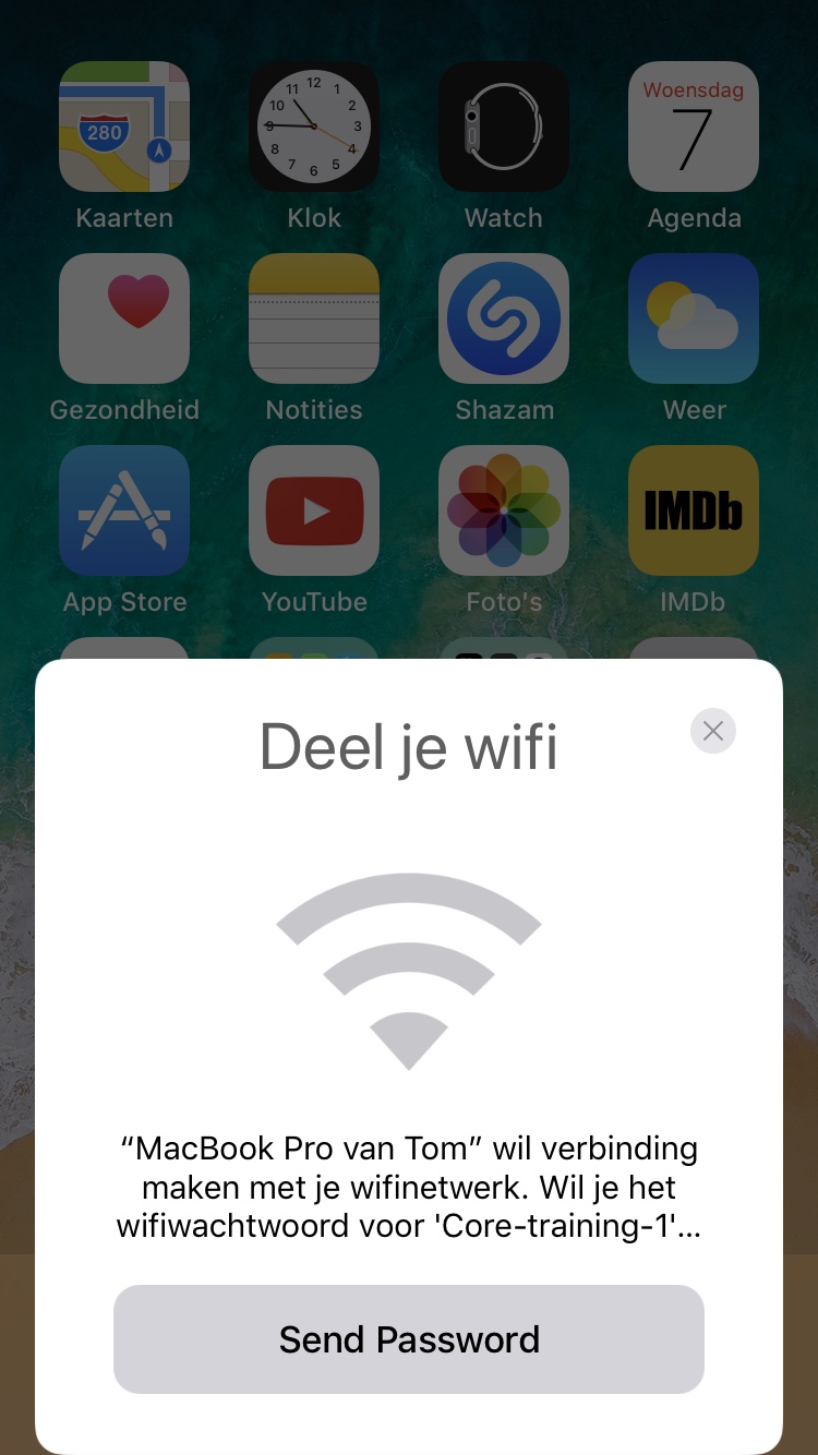 "MacBook Pro van Tom" wants to connect to your wi-fi network. Do you want to [share] the wi-fi password for 'Core-training-1'?