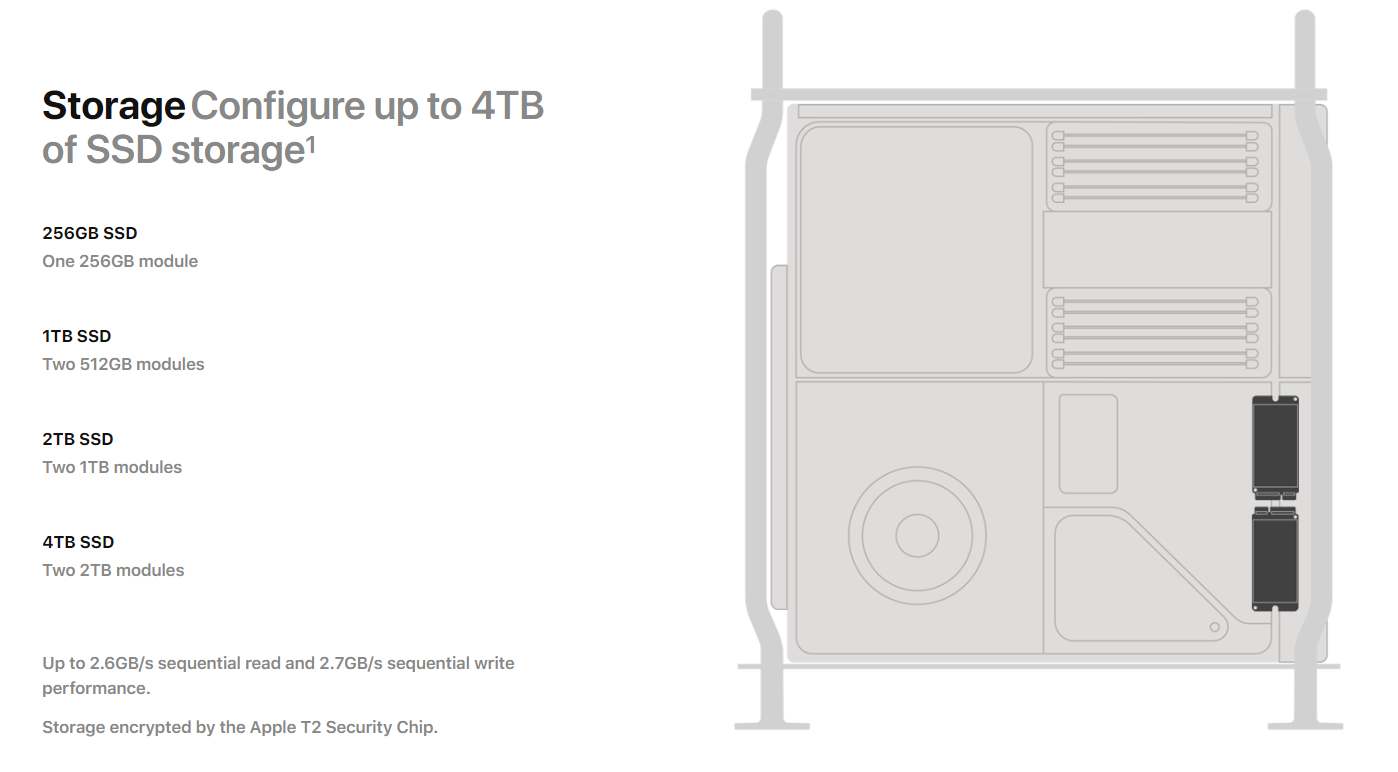 The T2 has a SSD controller logic inside of it. All it needs is NAND chips to 'talk' to complete the implementation of a full SSD. Apple probably has lifted the exact same design as the iMac Pro. Same upper cap of 4TB. The daughter cards don't have an SSD controller chip on them so they are not an SSD.