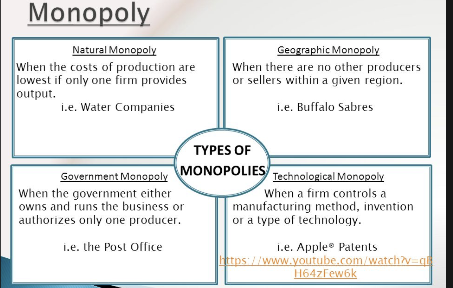 Government MonopolyTechnological Monopoly Natural MonopolyGeographic Monopoly TYPES OF MONOPOLIES When the costs of production are lowest if only one firm provides output. i.e. Water Companies When a firm controls a manufacturing method, invention or a type of technology. i.e. Apple® Patents...slideplayer.com