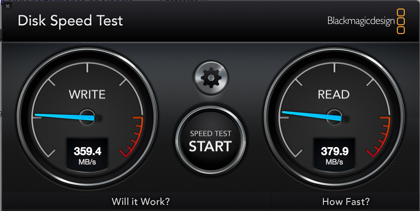 As a comparison, this is a speed test for a Samsung 256GB SSD connected via USB3 to the same machine