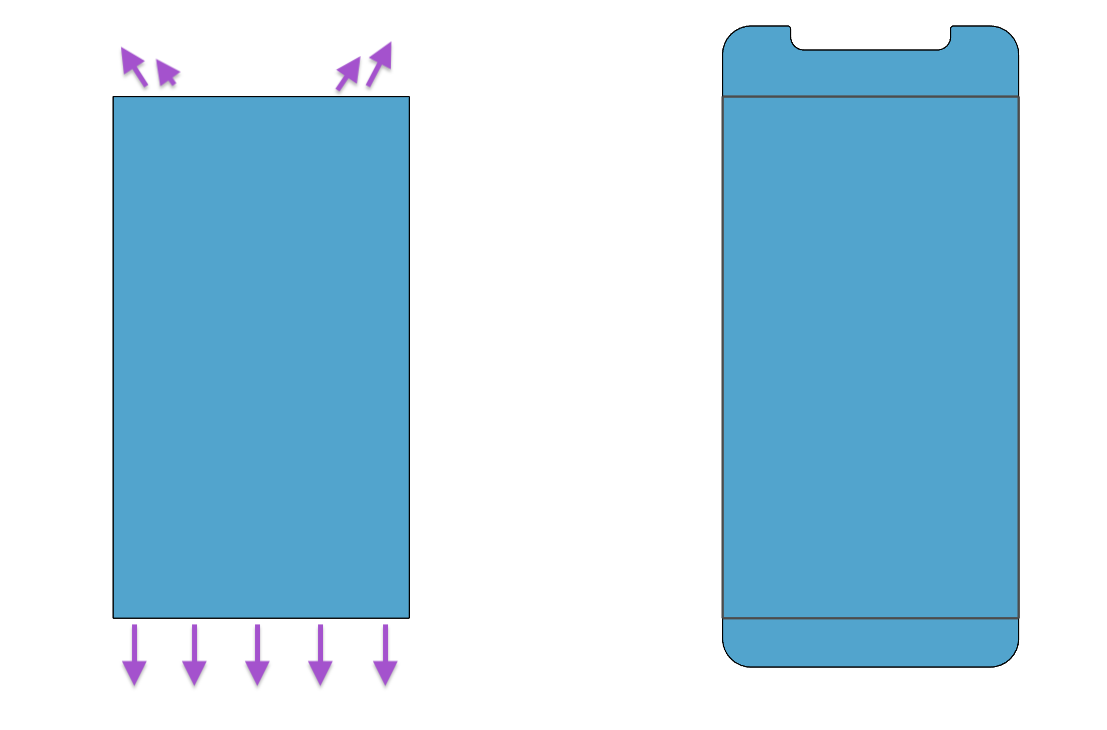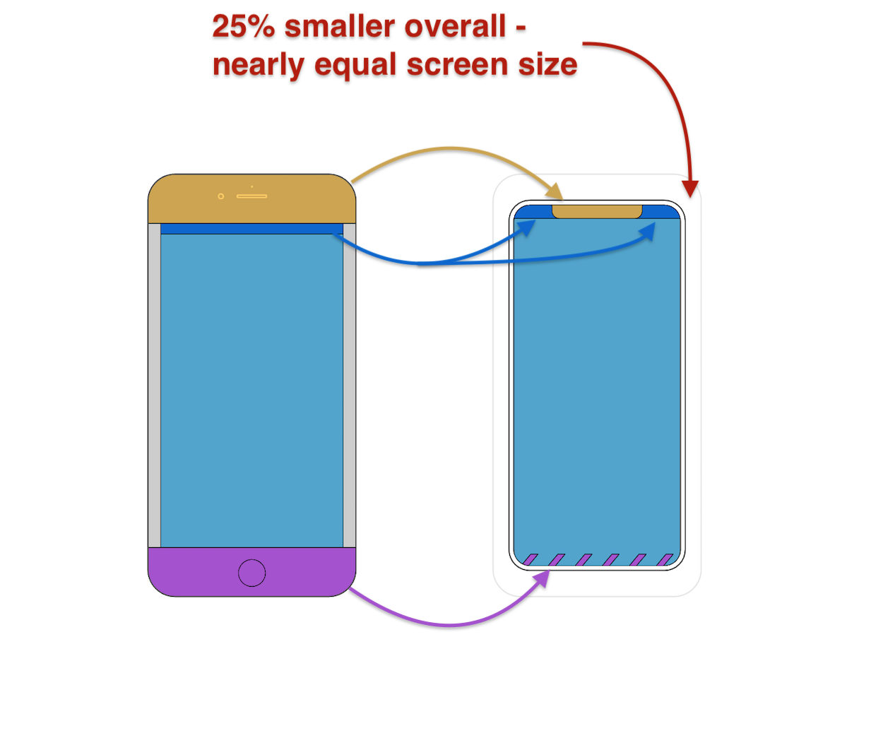 further, on a rectangular screen (plus), the whole top of the screen is dedicated as a 'closet' which houses the status info.. then there is another section above that (the top bezel) which contains the speaker and camera.. on the X, these two stagnant areas have been condensed into one row.. time/battery/signal status/camera/speaker/microphone/trueDepth sensors... all of that.. has been condensed into a thin strip along the top of the phone.. on the plus, it's taking about 6or7 of those strips to do the same (well, less) functions..
