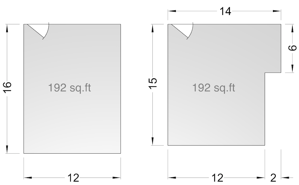 ..they're both the same size.. the one on the left is a rectangle and the one on the right is the same rectangle except 1' has been removed from the length and this area was reshaped/relocated to form a nook or closet.